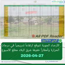 الأرصاد الجوية: تتوقع ارتفاع درجات الحرارة غدا السبت مع أتربة تحد من الرؤية بعدة مناطق