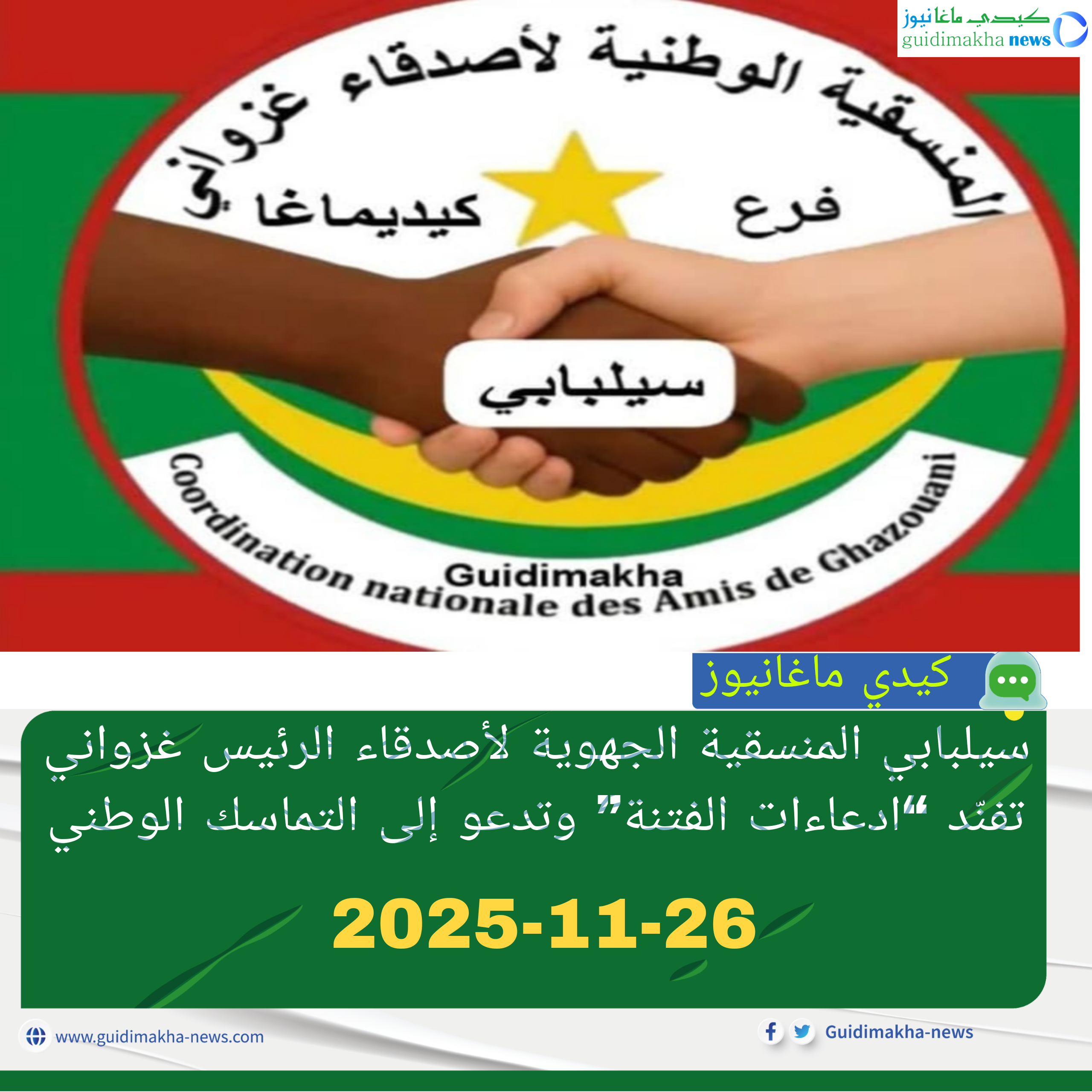أصدرت المنسقية الجهوية لأصدقاء الرئيس محمد ولد الشيخ الغزواني بسيلبابي بياناً أكدت فيه رفضها لما وصفته بـ"ادعاءات نواب الفتنة"، معتبرة أن بعض الأصوات تسعى إلى تأجيج الخلافات وإحياء الجراح بين أبناء الوطن الواحد خدمةً لأجندات ضيقة ومحاولات لإعادة ترويج تجارب “فاشلة” – وفق تعبير البيان.