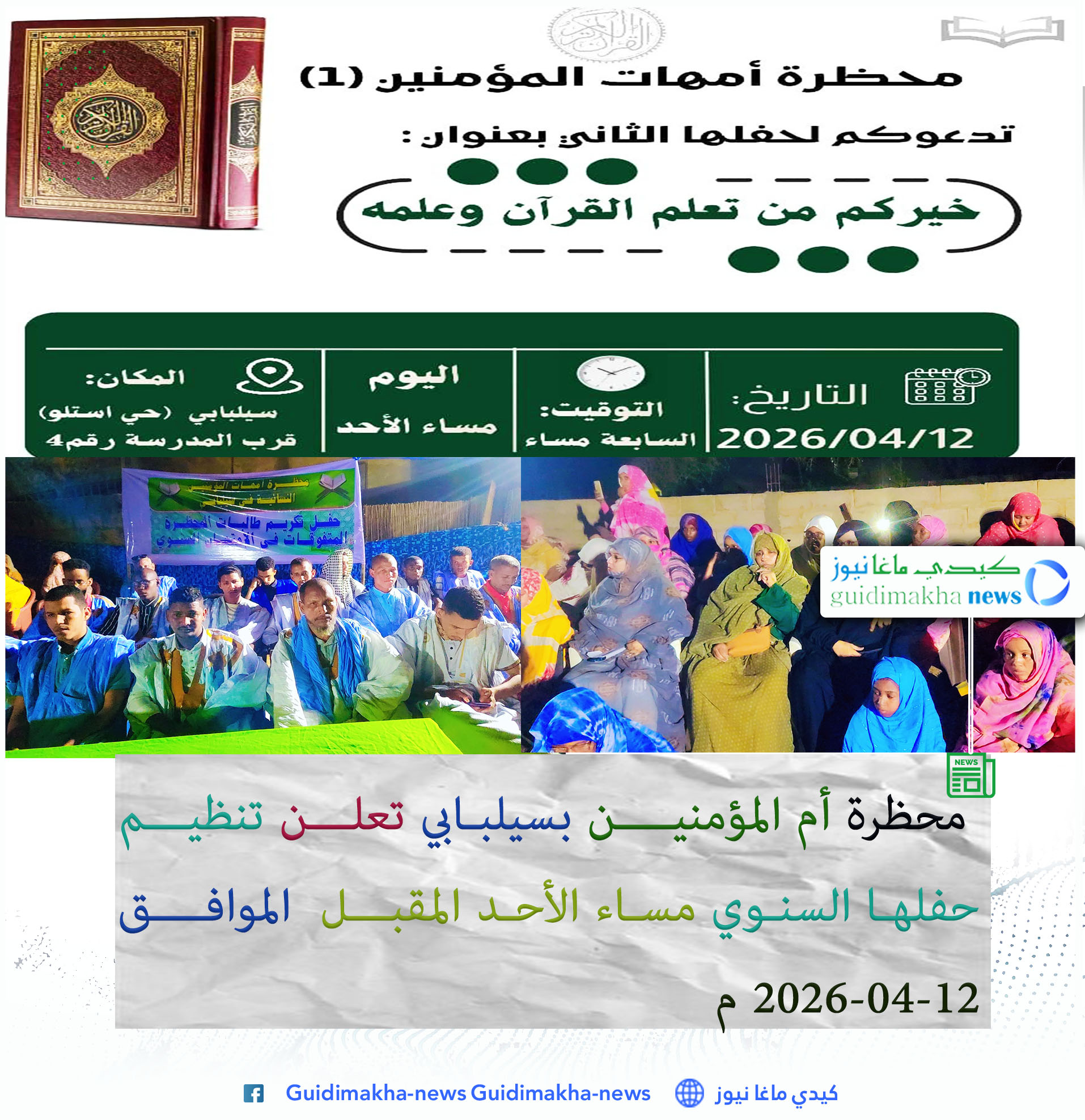 أعلنت محظرة “أم المؤمنين” بمدينة سيلبابي عن تنظيم حفلها السنوي في نسخته الثانية، وذلك مساء يوم الأحد الموافق 12 إبريل 2026، بمقرها الواقع قرب المدرسة رقم 04.