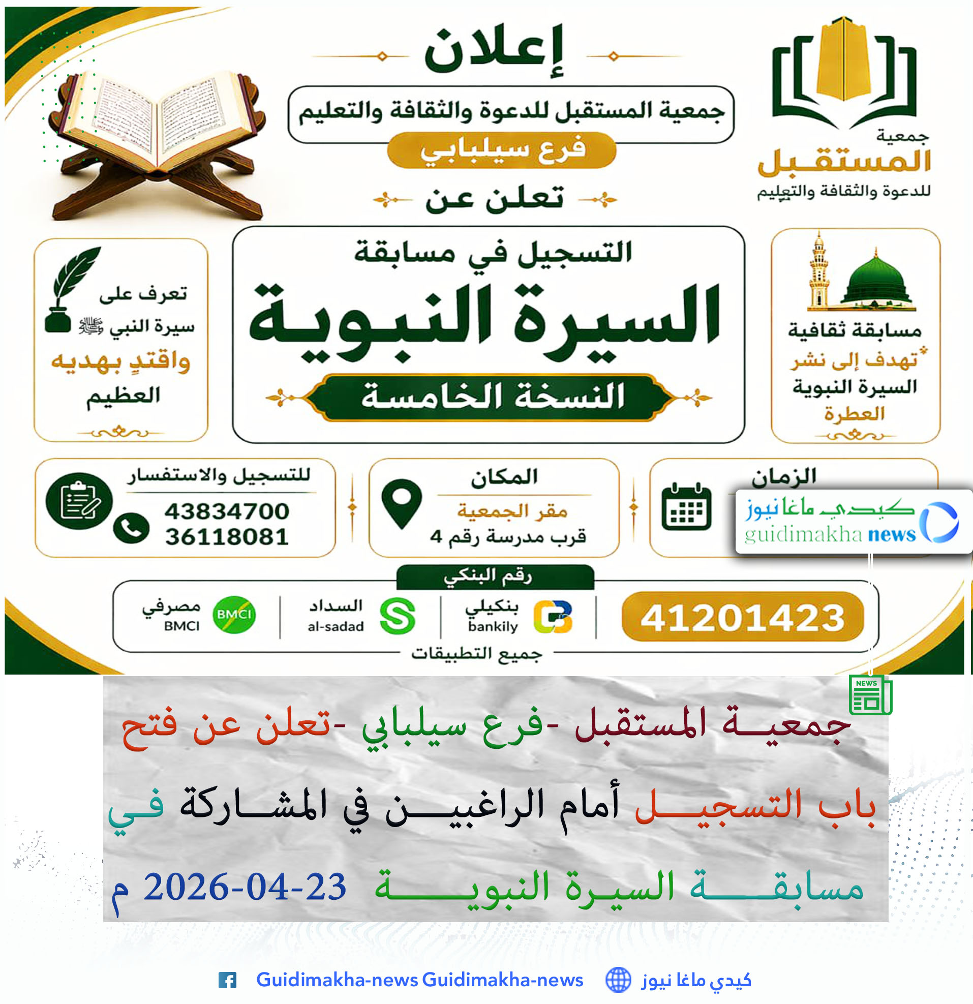 عبر منشور لها توصلنا في موقع كيدي ماغانيوز على نسخة منه أعلنت جمعية المستقبل للدعوة والثقافة والتعليم-فرع سيلبابي- عن فتح باب التسجيل أمام الراغبين في المشاركة في مسابقة السيرة النبوية في نسختها الخامسة إبتداء من 24 إبريل الجاري وحتى 30 منه لعام 2026 م