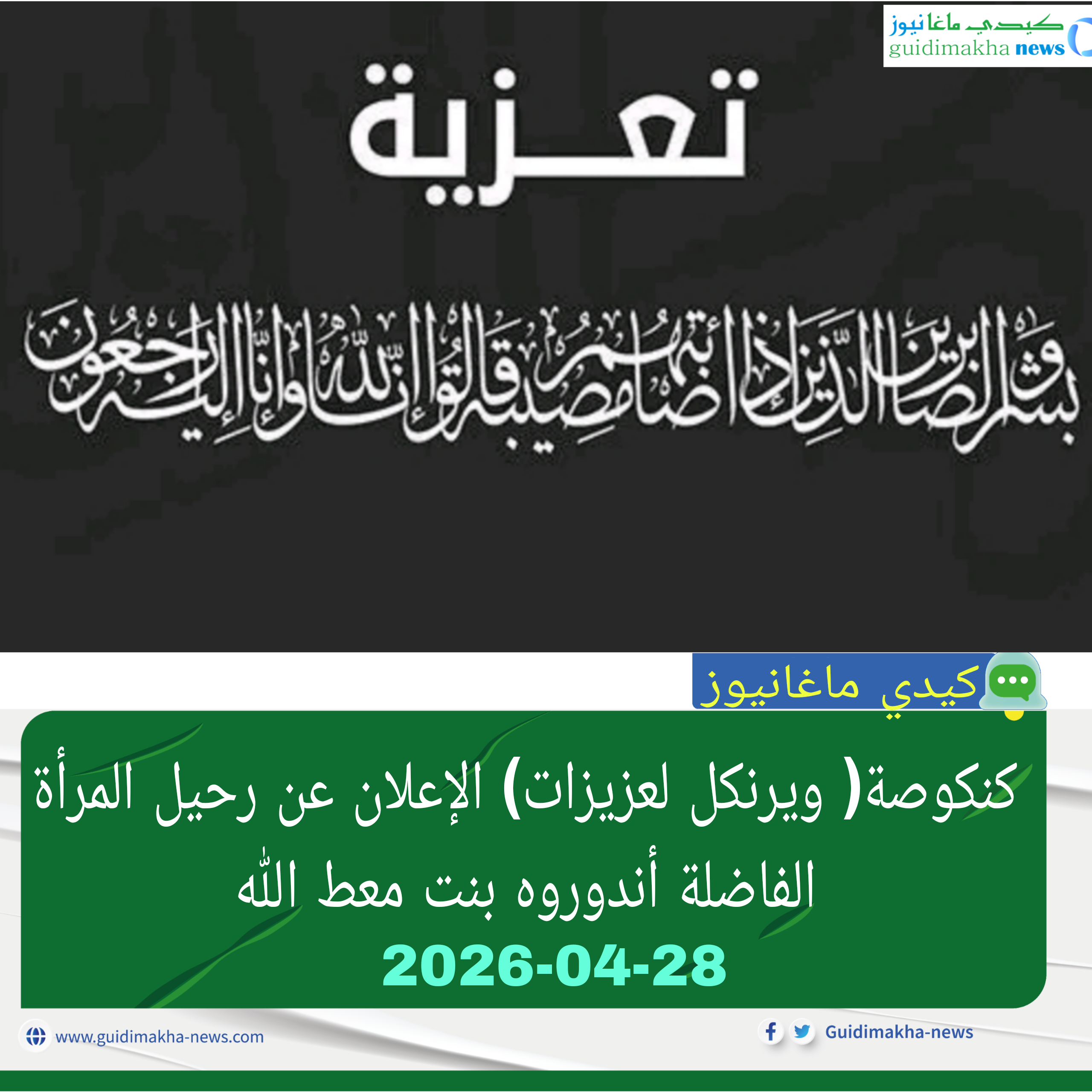 تلقينا ببالغ الأسى والحزن مساء اليوم الثلاثاء 28-04-2026 م من قرية ويرنكل لعزيزات التابعة لمقاطعة كنكوصة نبأ وفاة المغفور لها بإذن الله تعالى المرأة الفاضلة اندوروه منت معط الله بعد صراع قصير مع المرض وبهذه المناسبة الأليمة أتقدم باسمي شخصيا ونيابة عن باقي أفراد الأسرة بخالص عبارات العزاء والمواساة لعموم مجمتع الأخوال الأعزاء "لعزيزات" إثر المصاب الجلل راجين من المولى عز وجل أن يتغمد الفقيدة بواسع رحمته وأن يسكنها فسيح جناته و أن يلهم ذويها الصبر والسلوان وإنا لله وإنا إليه راجعون