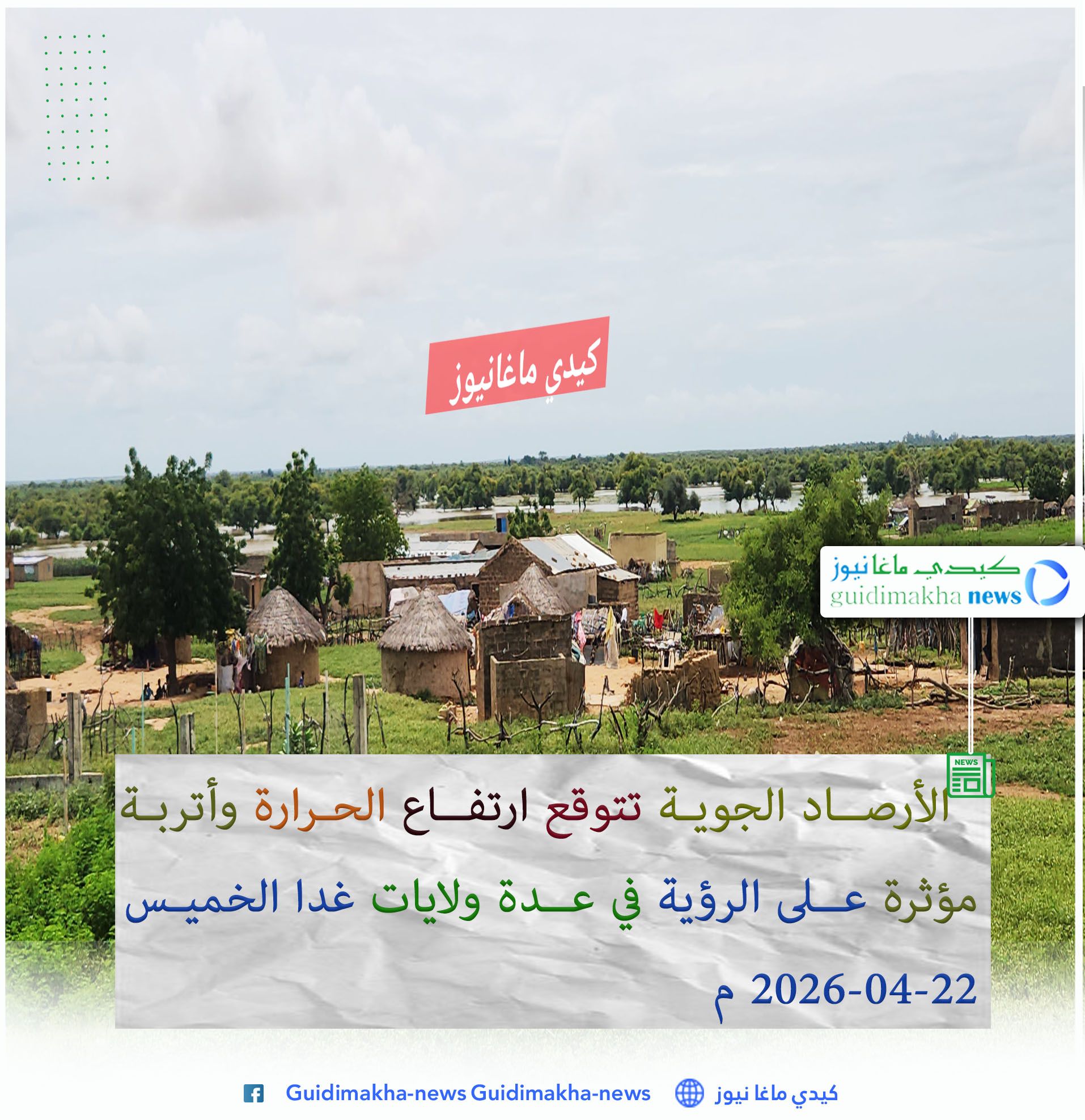 توقعت الهيئة الوطنية للأرصاد الجوية أن تتميز الحالة العامة للطقس يوم غد الخميس، بإذن الله تعالى، بارتفاع في درجات الحرارة على المناطق الجنوبية والوسطى من البلاد، مع تدنٍ في مستوى الرؤية بفعل الأتربة في عدد من الولايات.