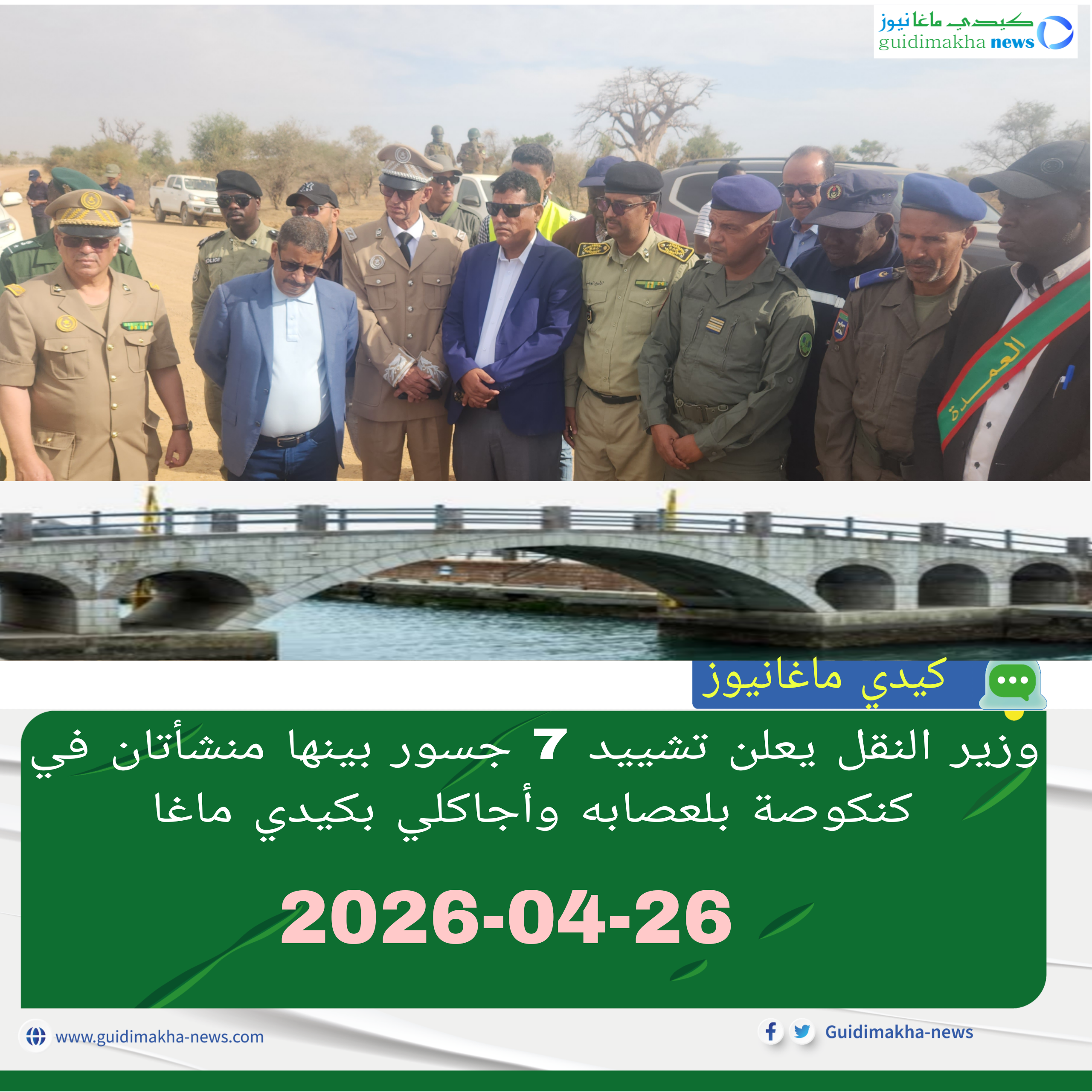 أعلن وزير التجهيز والنقل، اعل ولد الفيرك، برمجة إنشاء سبعة جسور جديدة ضمن خطة حكومية لتطوير البنية التحتية، موضحًا أن خمسة منها ستُشيَّد في العاصمة نواكشوط، فيما سيقام جسران في الداخل، أحدهما على بحيرة كنكوصة بولاية لعصابه، والثاني في منطقة أجاكلي بولاية كيدي ماغا.