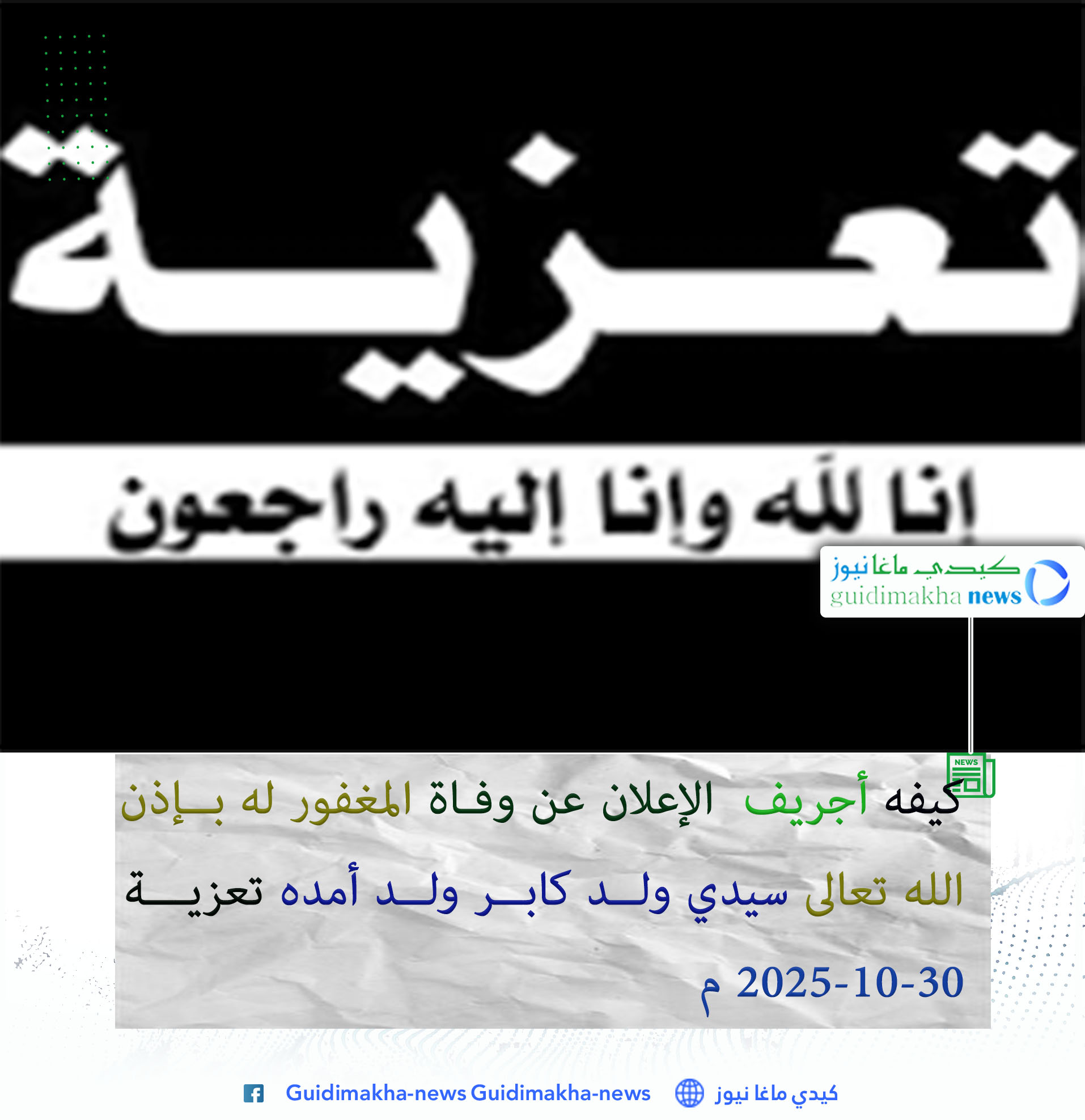 وبهذه المناسبة الأليمة، يتقدم مدير موقع كيدي ماغانيوز التراد ولد الإمام باسمه الشخصي ونيابةً عن طاقم الموقع، بخالص التعازي والمواساة إلى عموم المجتم