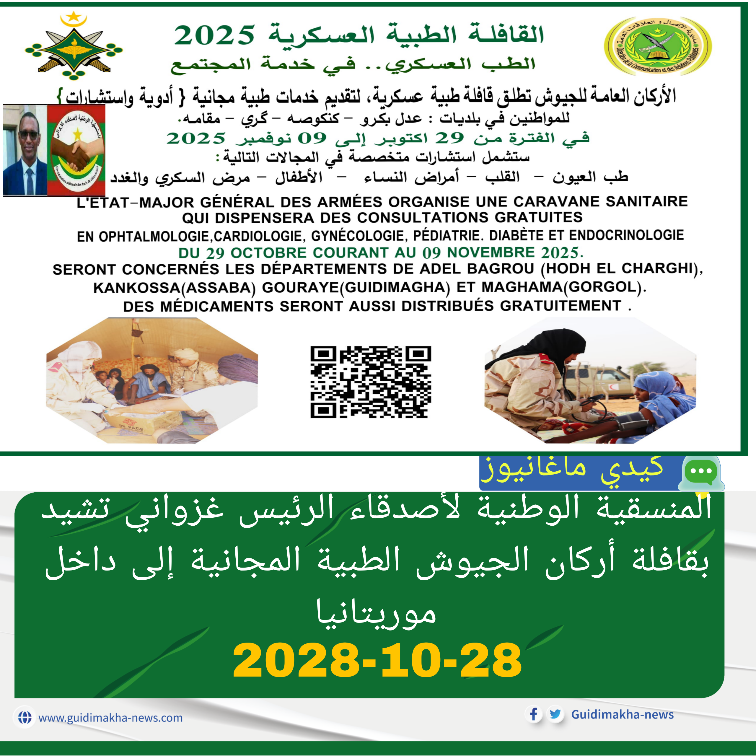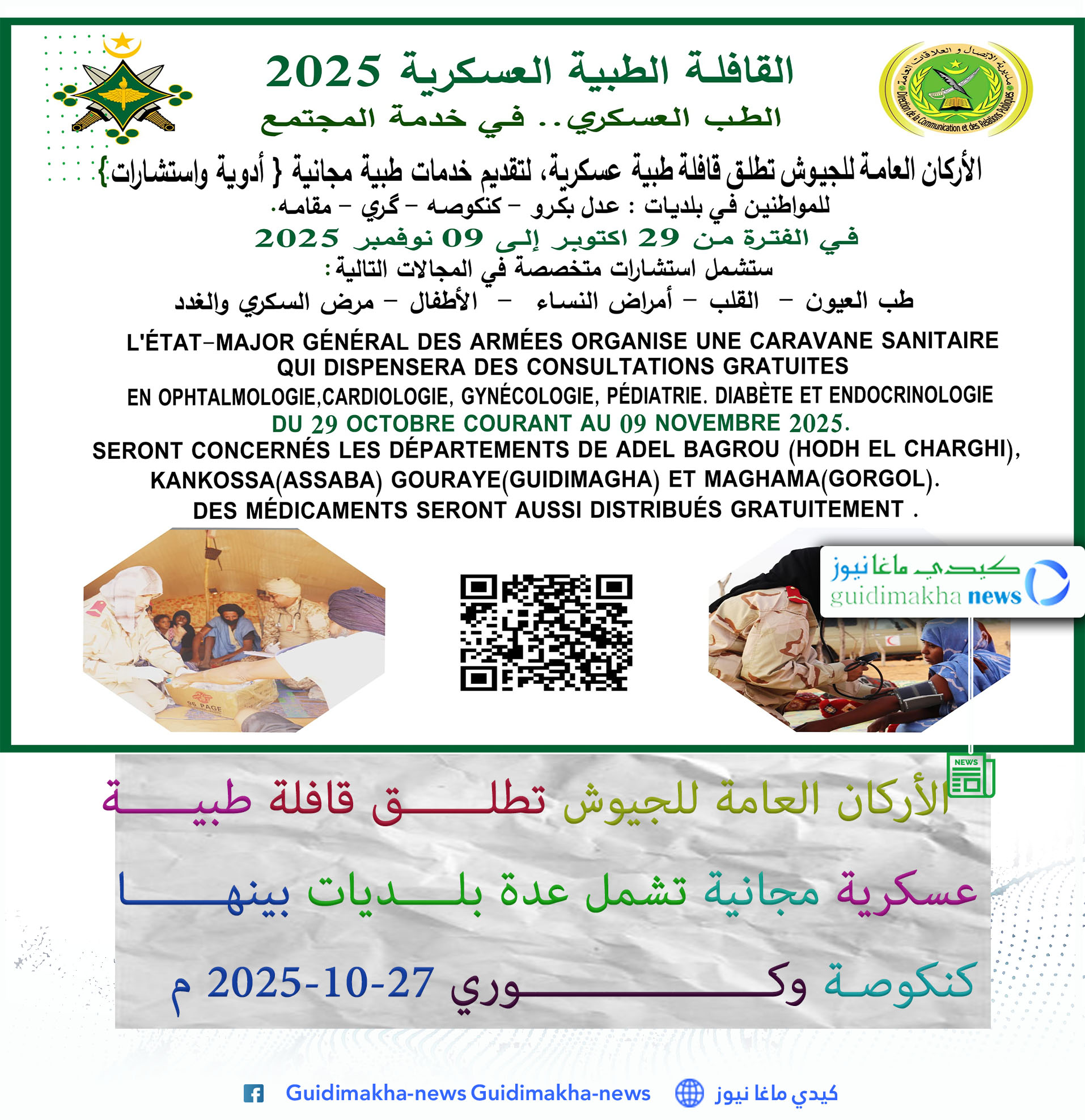 أعلنت الأركان العامة للجيوش الموريتانية عن انطلاق قافلة طبية عسكرية لتقديم خدمات صحية مجانية تشمل الاستشارات الطبية وتوزيع الأدوية على المواطنين في عدة بلديات، من بينها عدل بكرو، كنكوصة، كوري، ومقامه، وذلك خلال الفترة من 29 أكتوبر إلى 9 نوفمبر 2025.