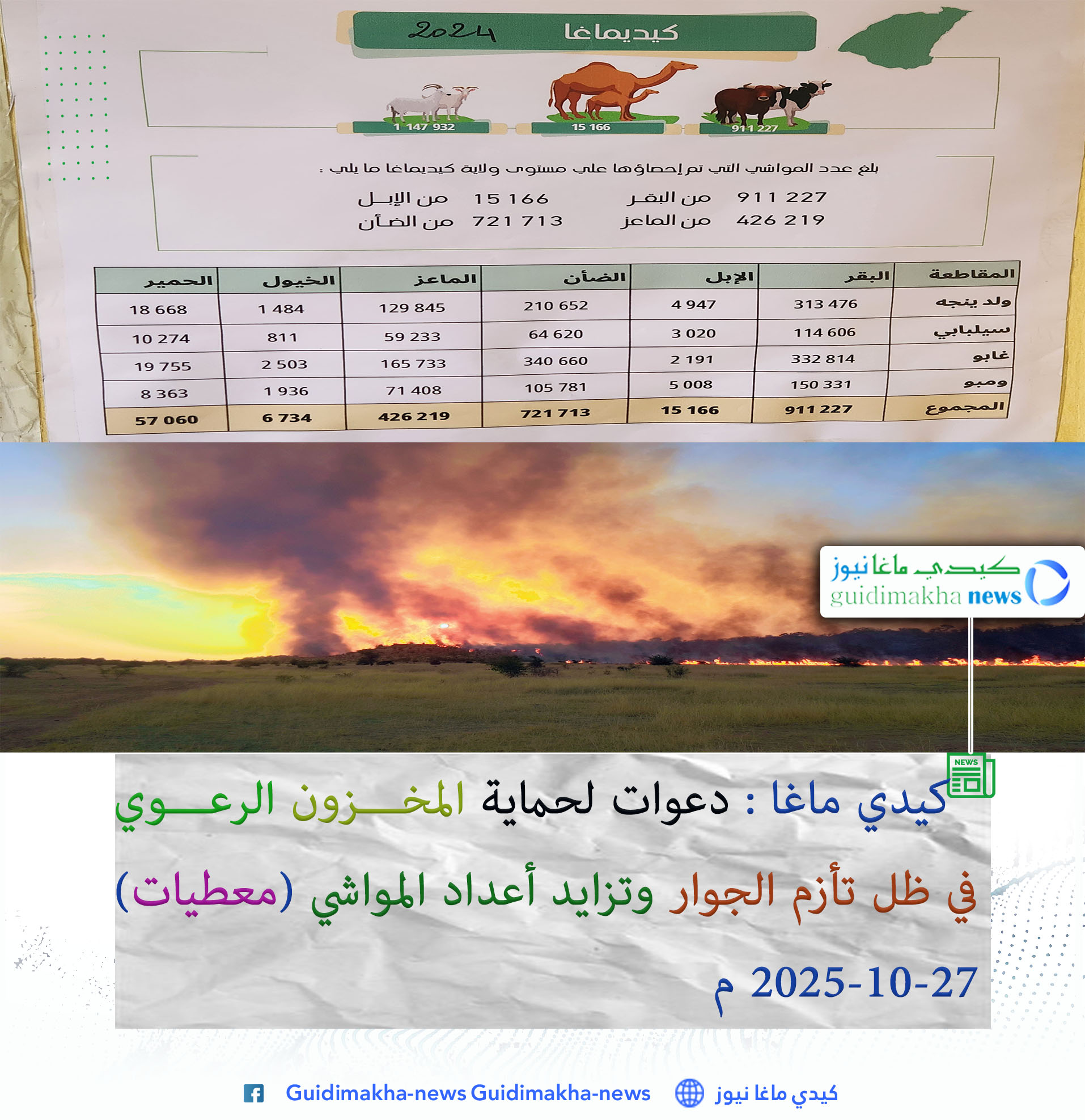 كيدي ماغا – كشفت النتائج الرسمية لعملية الإحصاء العام للثروة الحيوانية لسنة 2024، التي نظمتها وزارة التنمية الحيوانية، عن أرقام كبيرة في أعداد المواشي بولاية كيدي ماغا، مما يضع الولاية أمام تحديات بيئية ورعوية متزايدة، خصوصًا في ظل تأزم الوضع في الدولة المجاورة.