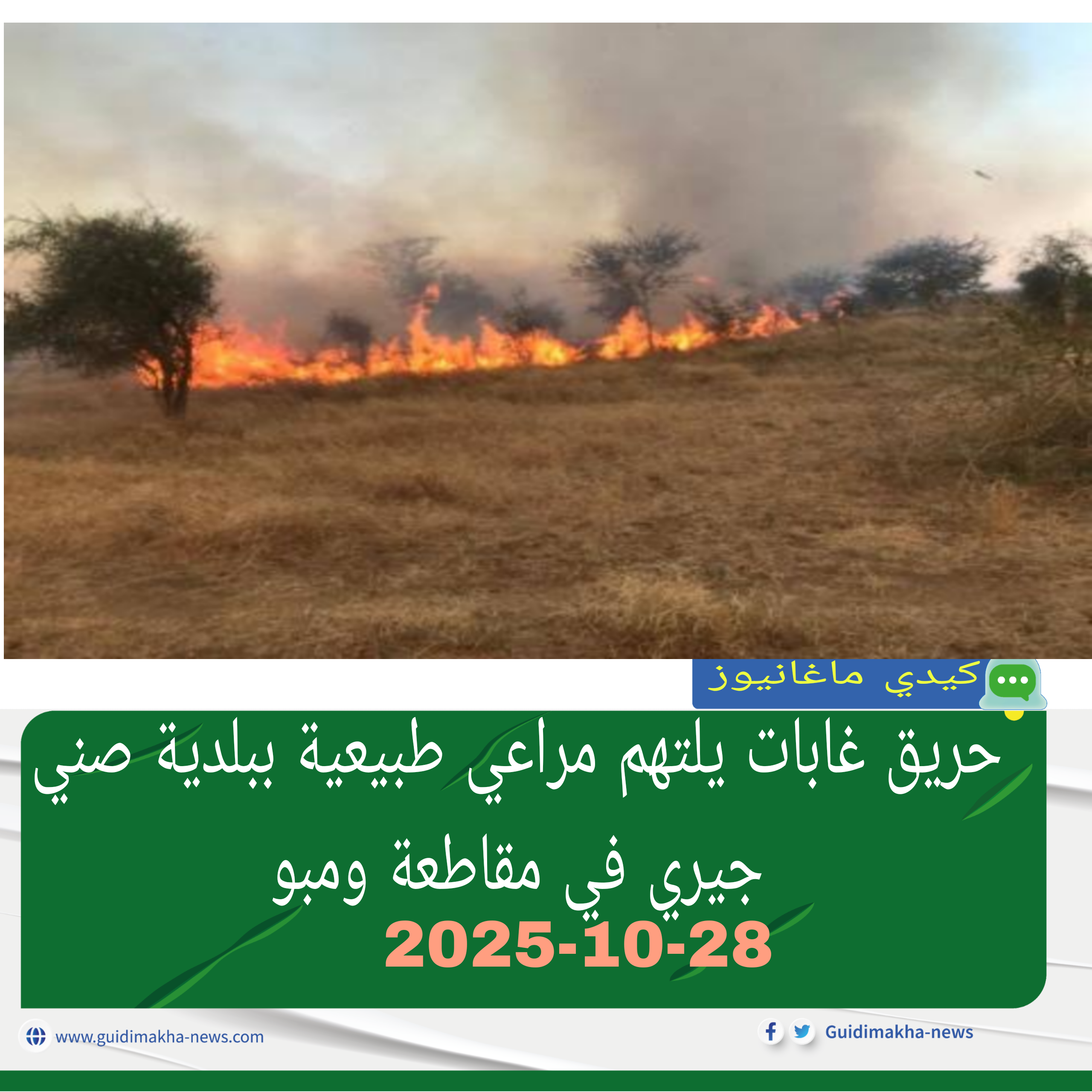 اندلع صباح أمس الاثنين حريق غابات واسع النطاق في إحدى الخزانات الرعوية التابعة لبلدية صني جيري بمقاطعة ومبو في ولاية كيدي ماغا، وفق ما أفادت به مصادر ميدانية لموقع كيدي ماغانيوز.