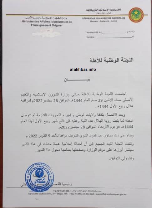 أعلنت اللجنة الوطنية للأهلة مساء اليوم أن بعد غد الأربعاء الموافق 28 سبتمبر هو فاتح شهر ربيع الأول من العام الهجري 1444.