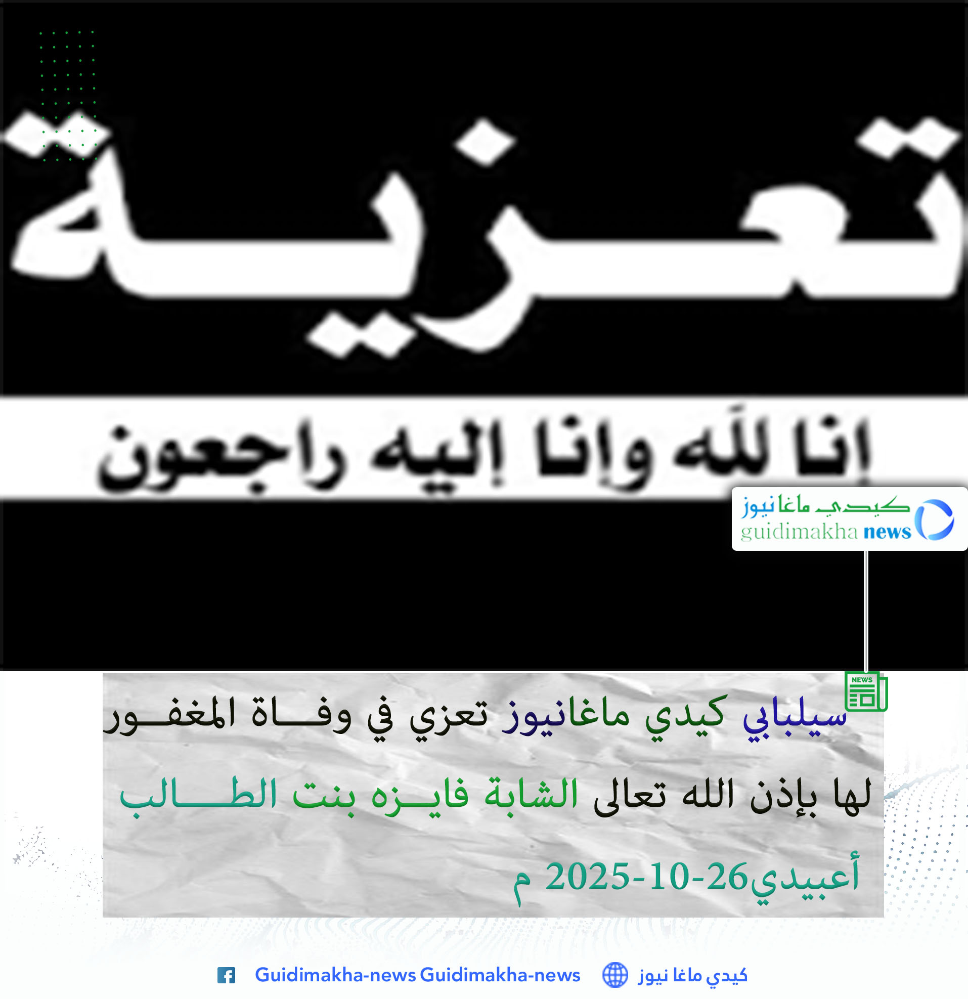 بقلوب مؤمنة بقضاء الله وقدره، وببالغ الحزن والأسى، تلقّى طاقم موقع كيدي ماغانيوز نبأ وفاة المغفور لها بإذن الله تعالى الشابة فايزة بنت شيخنا ولد الطالب أعبيدي، زوج عثمان ولد صالح، وذلك بالمستشفى الجهوي بمدينة كيفه، إثر عملية قيصرية.