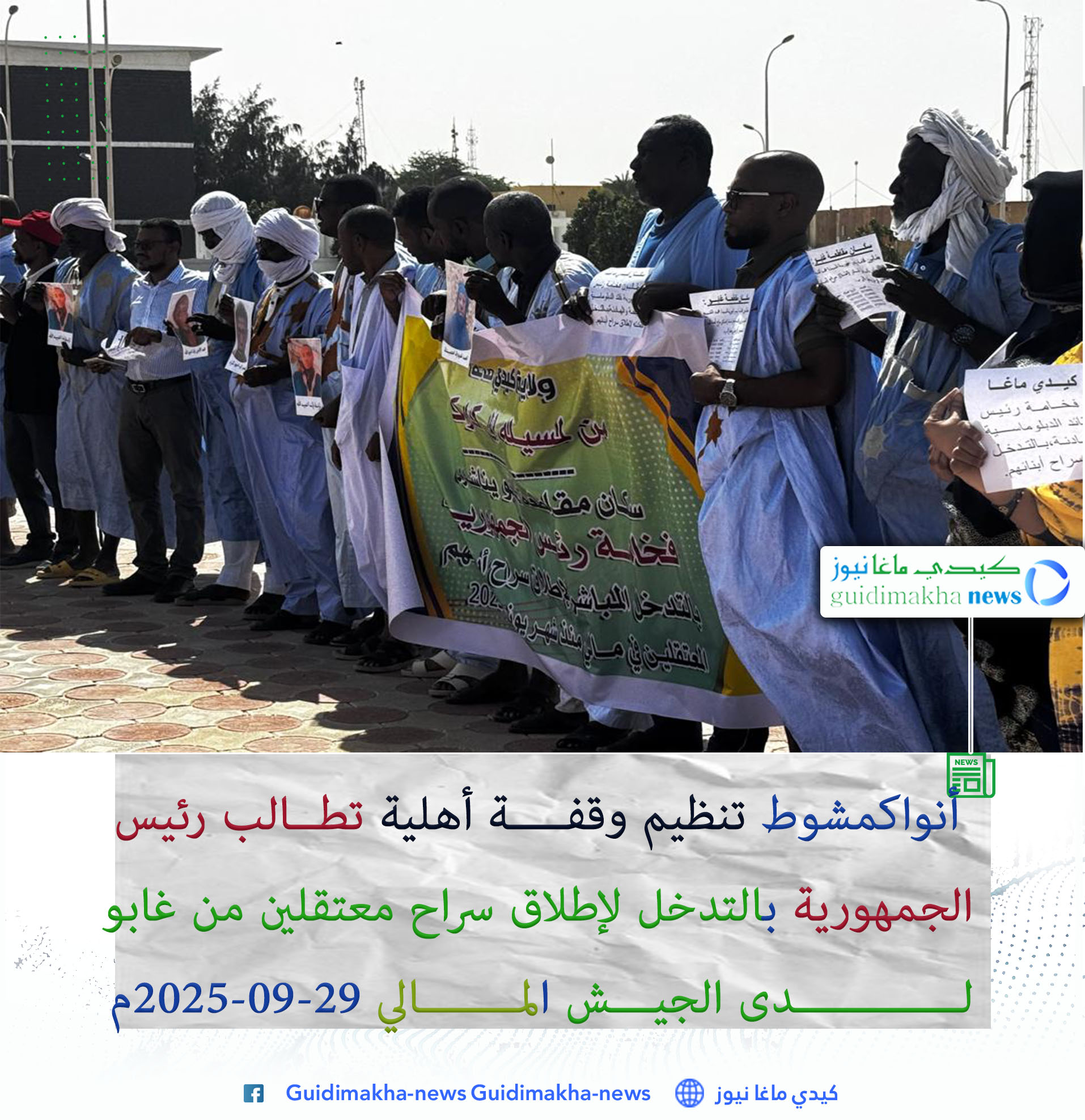 نظم صباح اليوم 29 سبتمبر 2025 م بالعاصمة الموريتانية أنواكشوط مجموعة من النشاط الشباب من ساكنة لمسيلة وكارا كورو بولاية كيدي وفقة طالبوا فيها رئيس الجمهورية محمد ولد الشيخ الغزواني شخصيا التدخل لإطلاق سراح مجموعة من الشباب ينحدرون من مقاطعة غابو تم احتجازهم منذ مايو الماضي من طرف الجيش المالي بعد دخولهم للأراضي المالية لاقتفاء أثر قطيع من الغنم بينما كان البعض من يبح