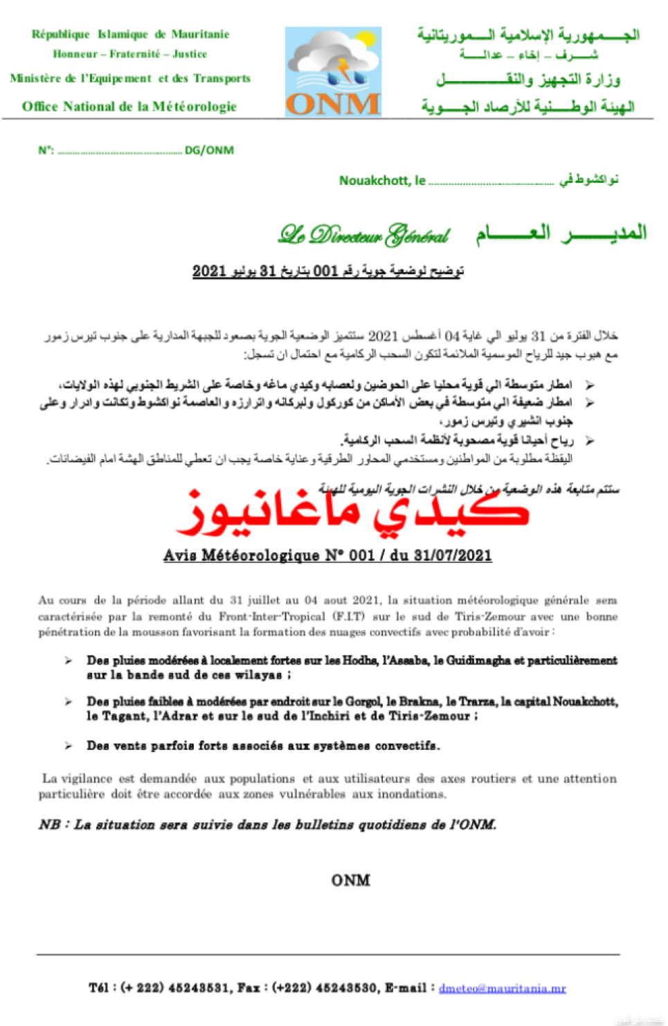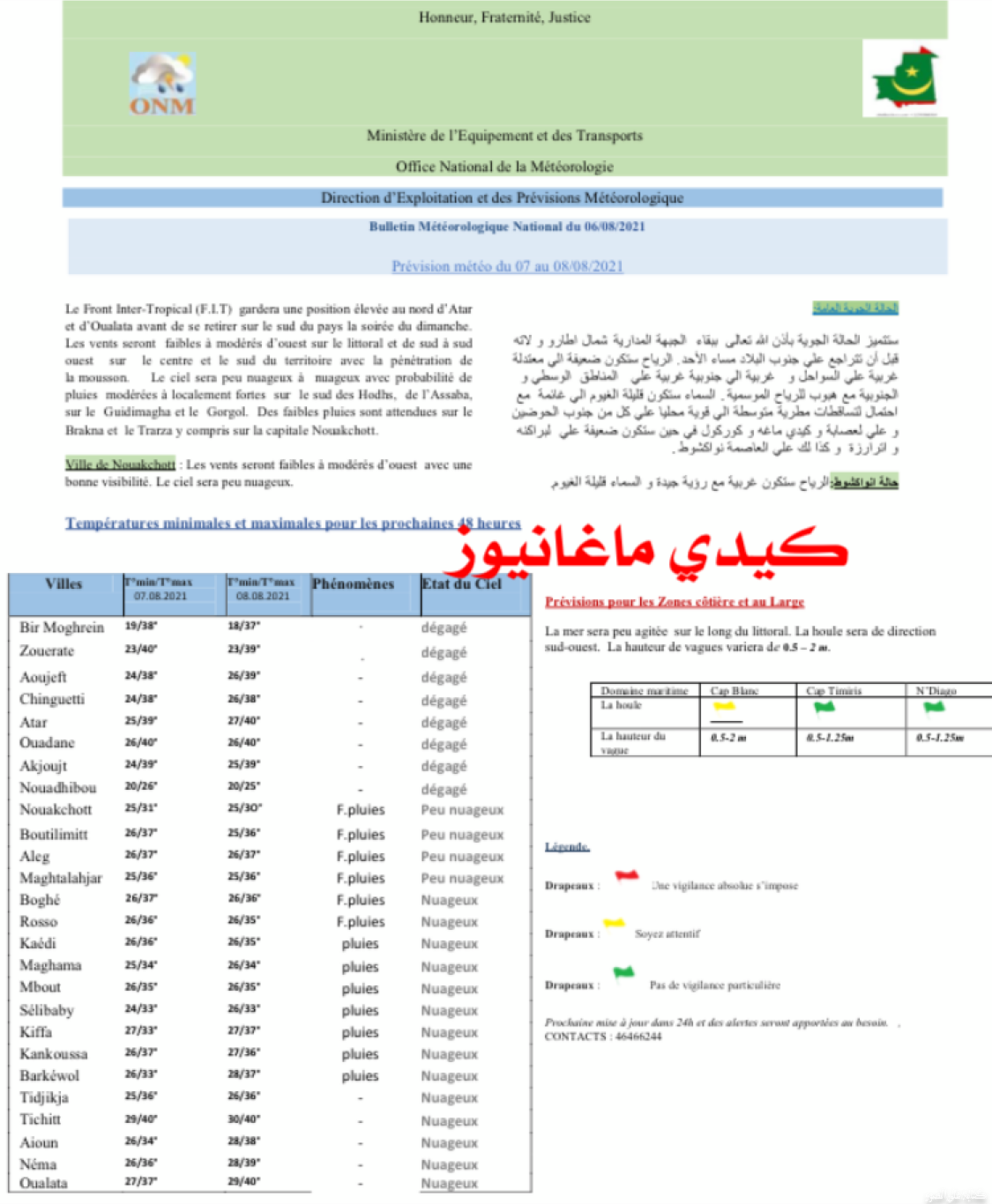 حسب الوثيقة الصادرة عن الهيئة الوطنية للأرصاد الجوية فإن حالة الطقس ستتميز بمرور الجبهة المدارية شمال أطار وولاته قبل أن تتراجع على جنوب البلاد مساء الأحد