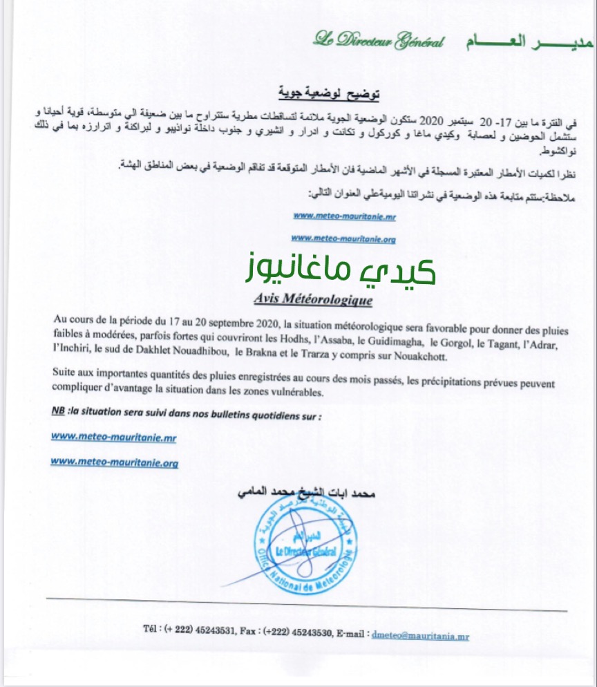 في توضيح لحالة جوية حصلت عليه كيدي ماغانيوز صادر من المدير العام للأرصاد الجوية يفيد أنه في الفترة المتدة مابين 17-20 من سبتمبر ستكون الوضعية ملائمة لتساقطات مطرية تتراوح بين ضعيفة، متوسطة وقوية أحيانا وستشمل الحوضين والعصابة وگيدي ماغا وگورگل وتگانت وإنشيري وجنوب داخلت أنواذيبو ولبراكنه وأترارزه بما في ذلك أنواكشوط .