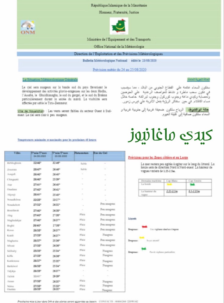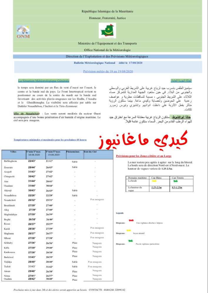 ومن المتوقع تكون سحب ممطرة علي إنشيري واقصي جنوب الحوضين ولعصابة وكيدي ماغة. في حين ستكون الرؤية متأثر بفعل الأتربة علي داخلت انواذيبو وإنشيري وتيرس زمور