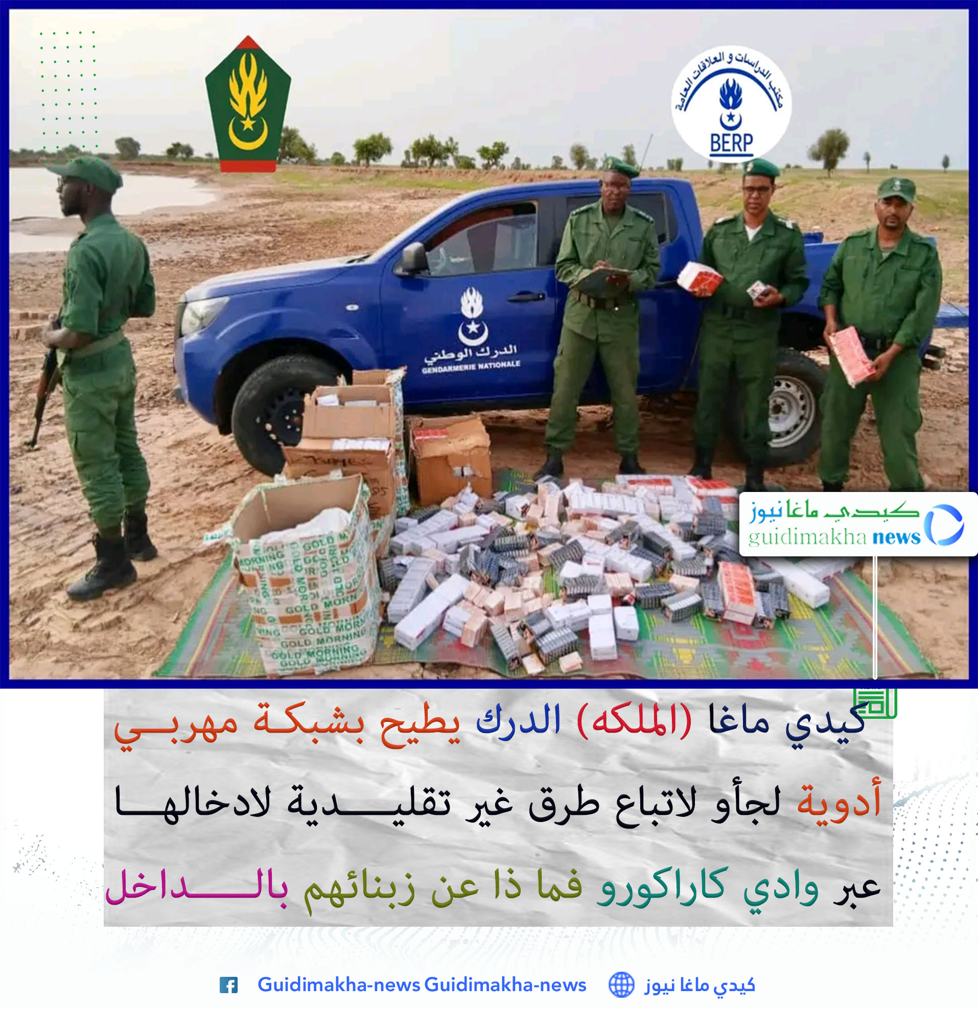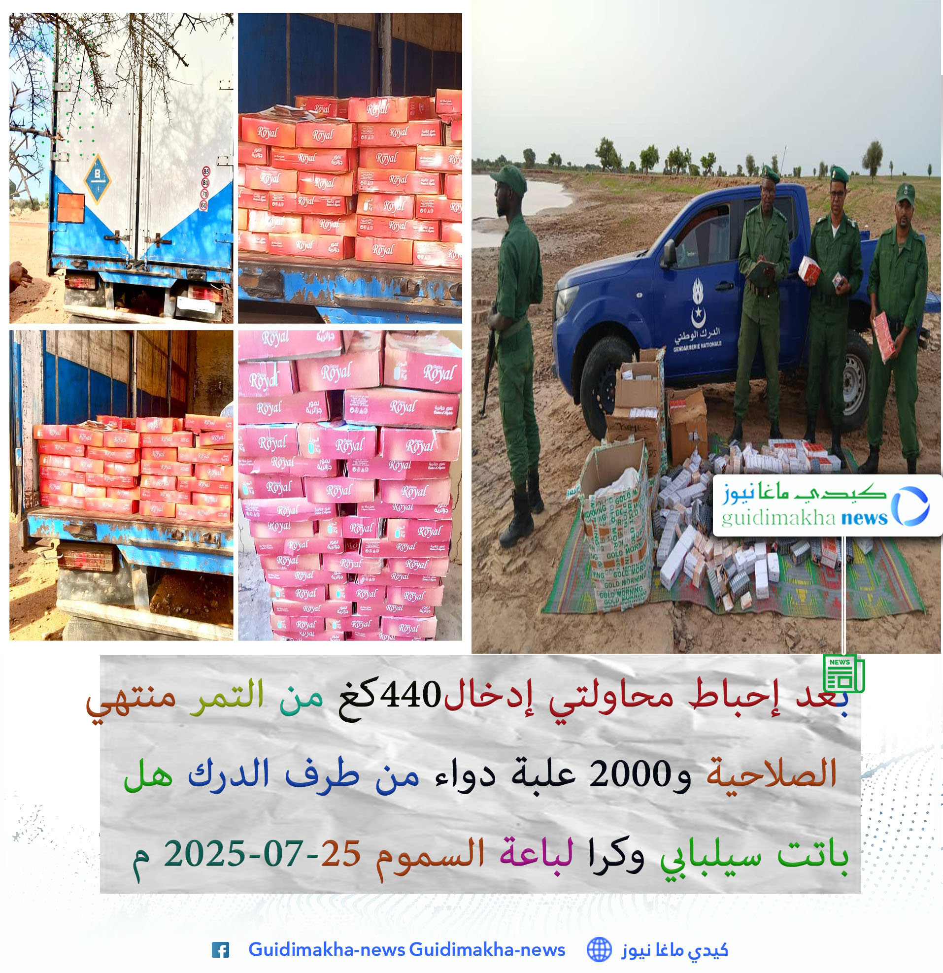 بحسب مصادر جد موثوقة فقد نجحت وحدات الدرك الوطني التابعة لكتيبة سيليبابي عاصمة ولاية كيدي ماغا بقرية الملكه مطلع الأسبوع الجاري بالتحديد مساء الإثنين 22 يوليو 2025 م من ضبط ومصادرة كميات معتبرة من الأدوية المهربة من دولة مالي المجاورة ناحية الحدودالجنوبية الشرقية (وادي كارا كورو ) على متن زورق خشبي للتمويه باتجاه قريةالشيه التي كان من المفترض أن تقل منها عبر