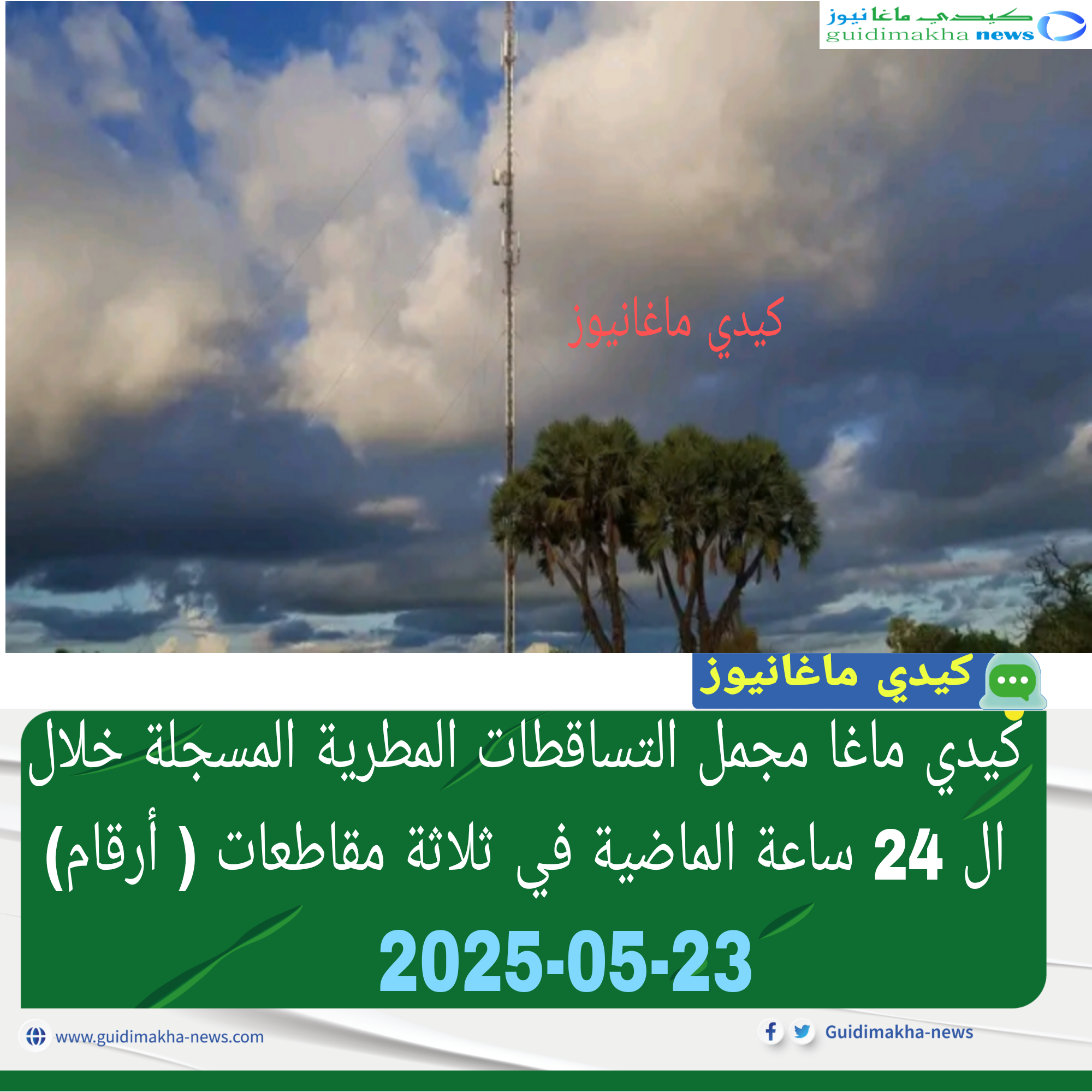عرفت ثلاثةمقاطعات من ولاية كيدي ماغا خلال ال 24 ساعة الماضية تسجيل تساقطات مطرية ضعيفة إلى متوسطة وذلك على النحول التالي