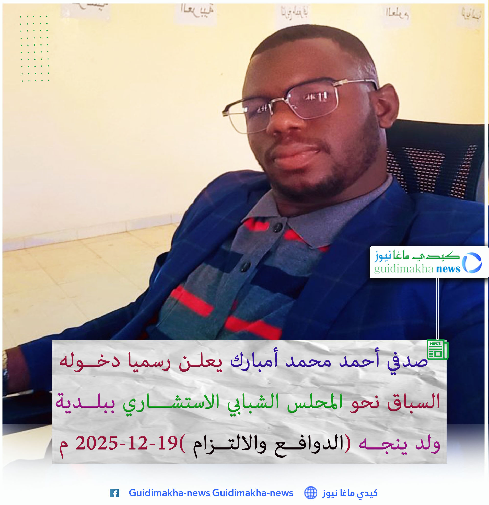 عبر إعلان توصل موقع كيدي ماغانيوز إلى نسخة منه اعلن الشاب صدفي أحمد محمد امبارك دخلوله السباق نحو الظفر بالمجلس الشبابي الاستشاري على مستوى مقاطعة ولد ينجه