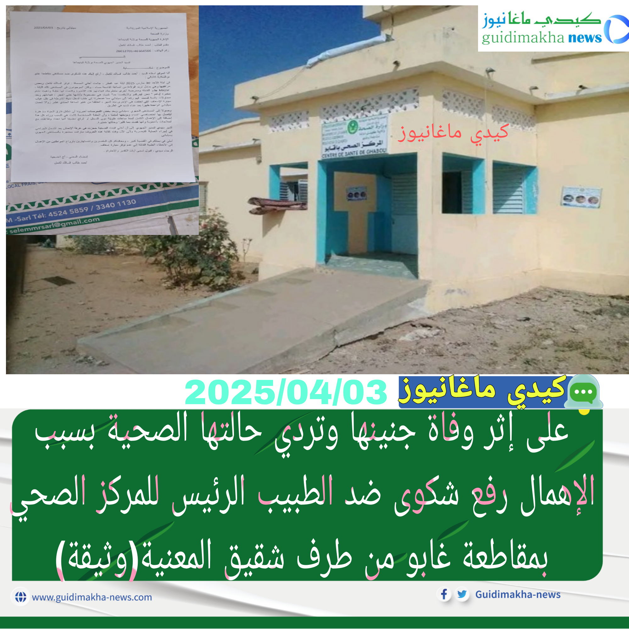 تقدم صباح اليوم الخميس 2025/04/03م لدى الإدارة الجهوية للعمل الصحي بعاصمة ولاية كيدي ماغا سيلبابي شقيق الضحية المسماة توتو بنت السالك لكحل السيد احمد طالب لكحل بشكوى ضد الطبيب الرئيس والقابلة والممرضة المتطوعة العاملتين بالمركز الصحي بمقاطعة غابو على إثر وفاة جنين وتردي الحالة الصحية لشقيقته بسبب ما يراه شقيق السيدة ولد لكحل تقصير وإهمال وعدم اكتراث وخبرة الذي كا