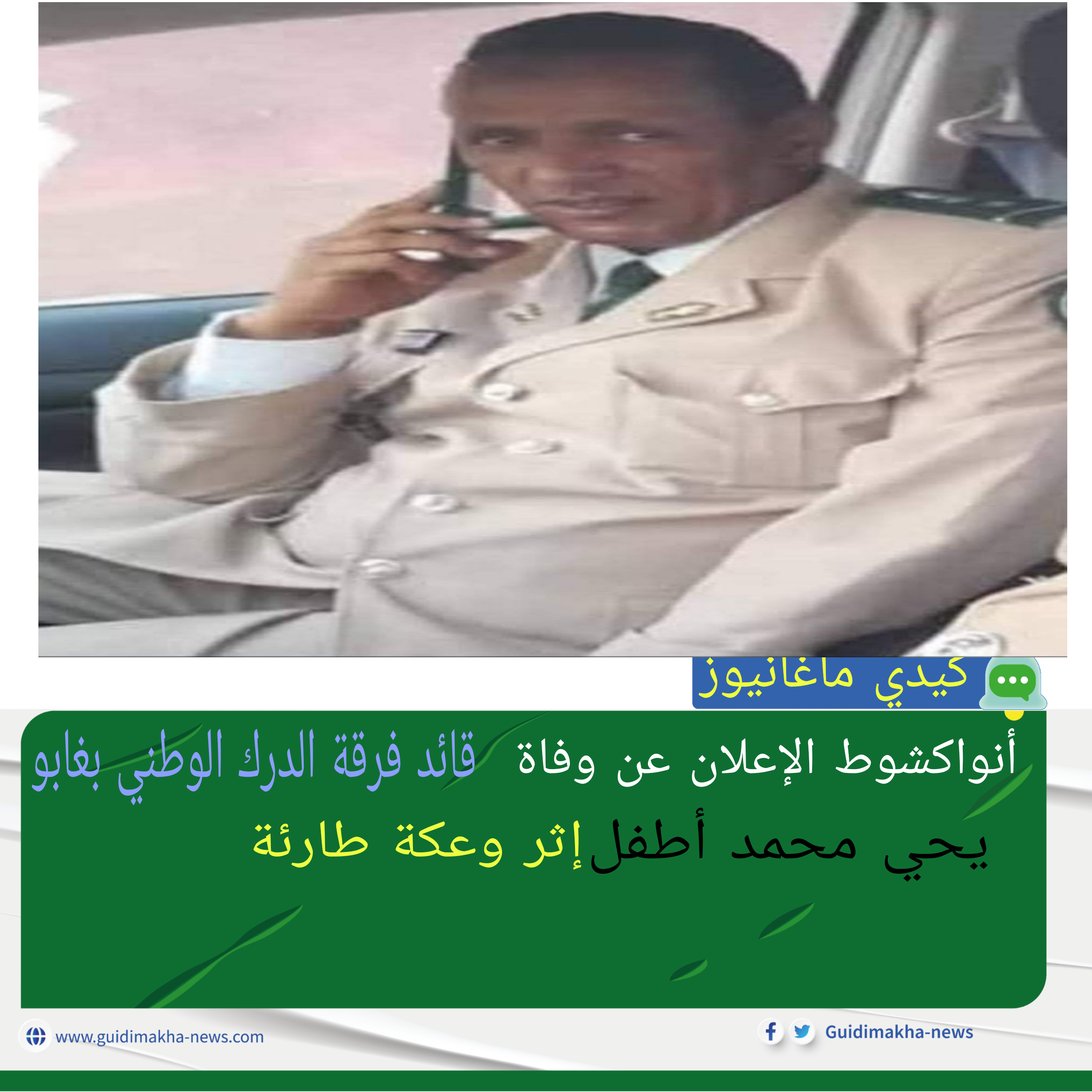 تلقينا ببالغ الأسى والحزن من العاصمة الموريتانية أنواكشوط صباح اليوم نبأ وفاة المغفور له بإذن الله تعالى يحي محمد أطفل قائد فرقة الدرك الوطني بغابو بعد تعرضه لوعكة صحية ألمت به مؤخرا استدعت نقله إلى العاصمة لتقي العلاج قبل أن يتم اليوم لإعلان عن رحيله وبهذه المناسبة الأليمة لا يستغنا في موقع كيدي ماغانيوز إلا أن نرفع خالص العزاء والمواساة إلى ذوي وأصدقاء ومعارف الفقي