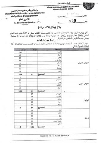 تعلن وزارة التربية وإصلاح النظام التعليمي عن تنظيم مسابقة اكتتاب محلي لـ 800 مقدم خدمة تعليم أساسي (500) معلم مزدوج و 300 معلم (عربية) وذلك يوم 2024/10/16 عند الساعة 8 صباحا بمباني مدرسة تكوين المعلمين بنواكشوط.