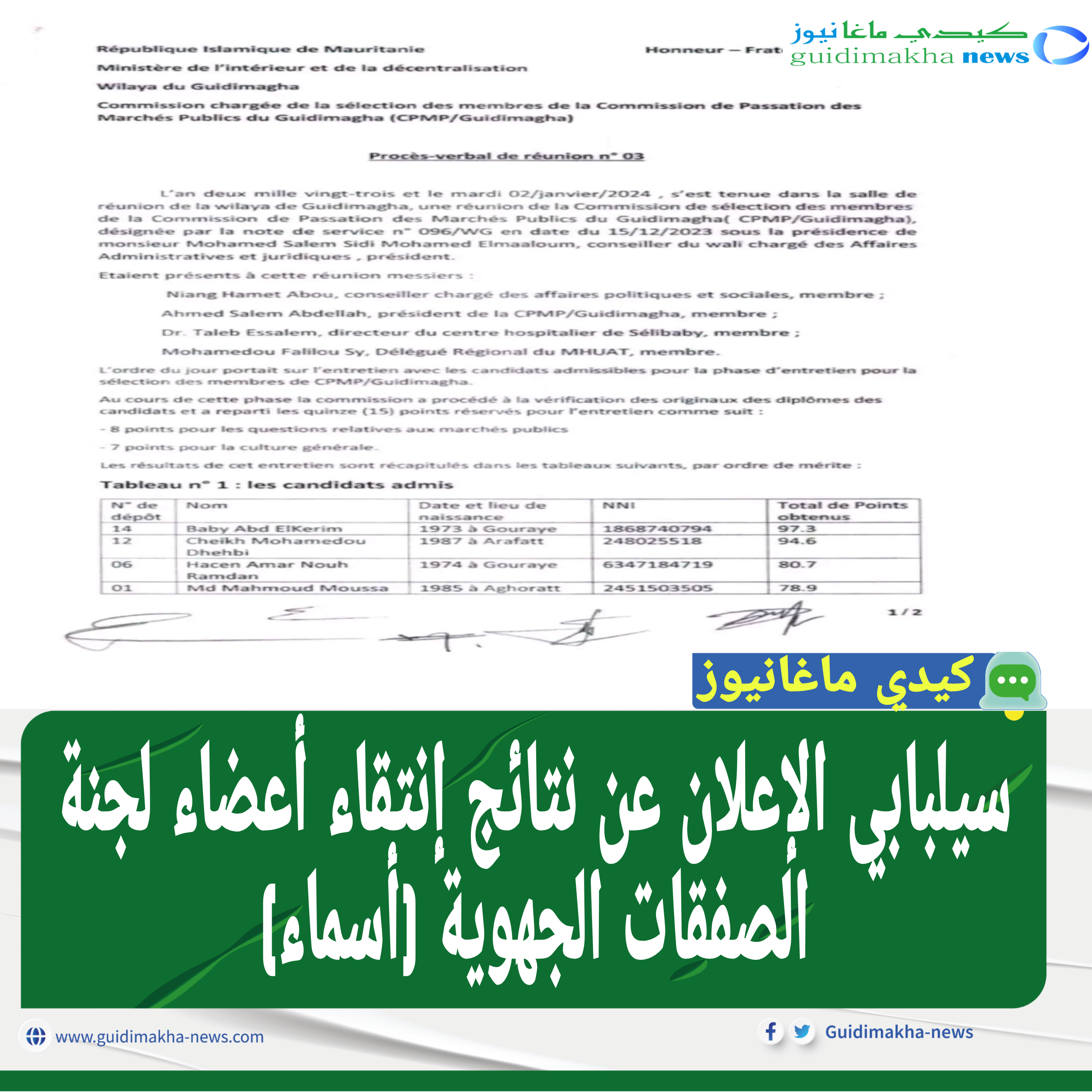 أعلن يوم أمس الإثنين عن نتائج انتقاء أعضاء لجنة الصفات الجهوية على مستوى ولاية كيدي ماغا والبالغ عددهم أربعة أشخاص تم إختيارهم - وفق معايير- من بين المتقدمين لشغل منصب عضوية لجنة الصفقات الجهوية التي يتم تعيين رئيسها من طرف الوزير الأول