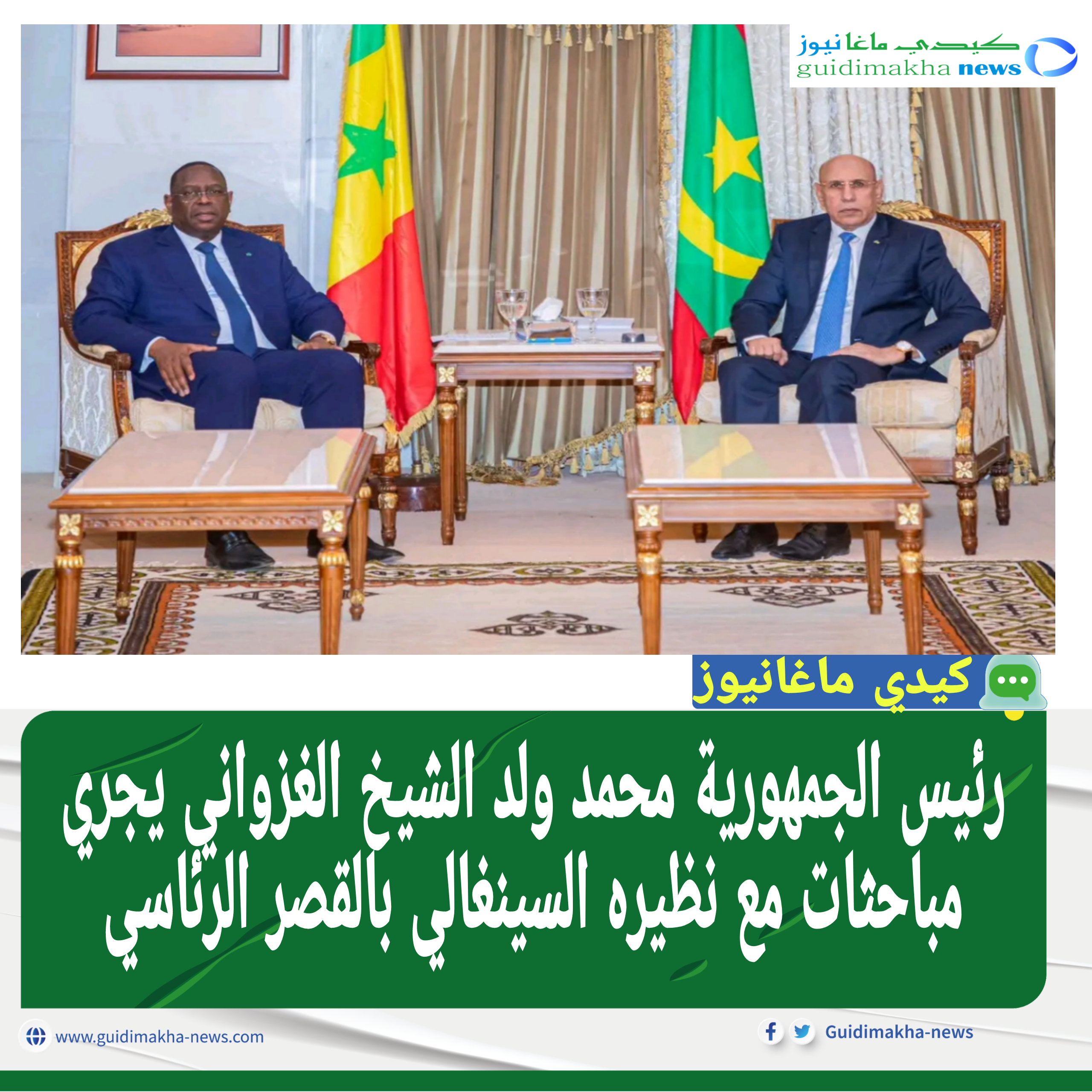 أجرى فخامة رئيس الجمهورية السيد محمد ولد الشيخ الغزواني زوال اليوم الخميس بالقصر الرئاسي مباحثات مع فخامة الرئيس السنغالي السيد ماكي صال.