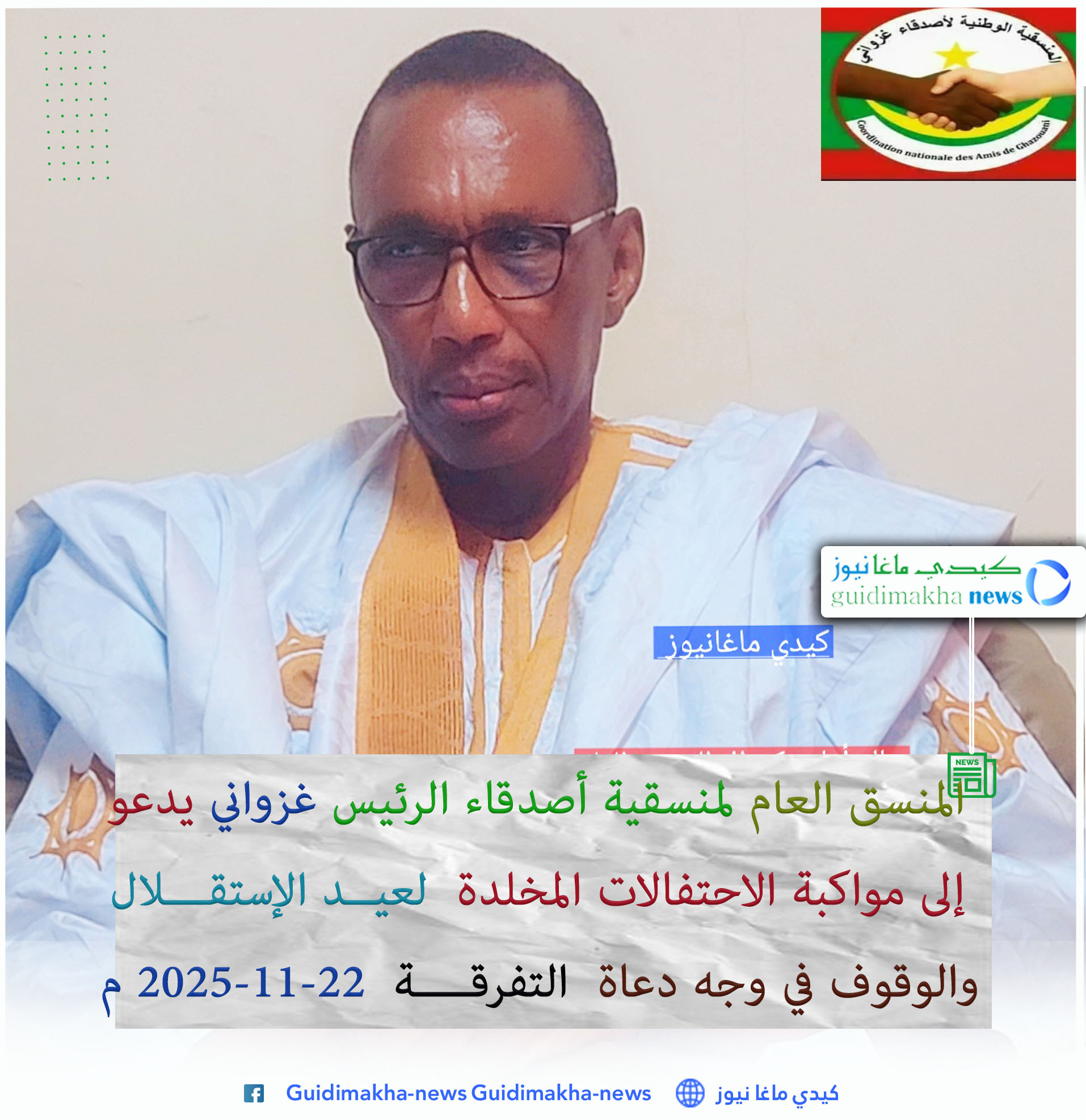 دعا المنسق العام لمنسقية أصدقاء الرئيس محمد ولد الشيخ الغزواني، الأستاذ جالو آمادو كورال، الشعب الموريتاني إلى مواكبة الاحتفالات المخلدة للذكرى الـ65 لعيد الاستقلال الوطني، مؤكداً أن هذه المناسبة تشكل رمزاً للسيادة والحرية والانعتاق من الهيمنة الأجنبية.