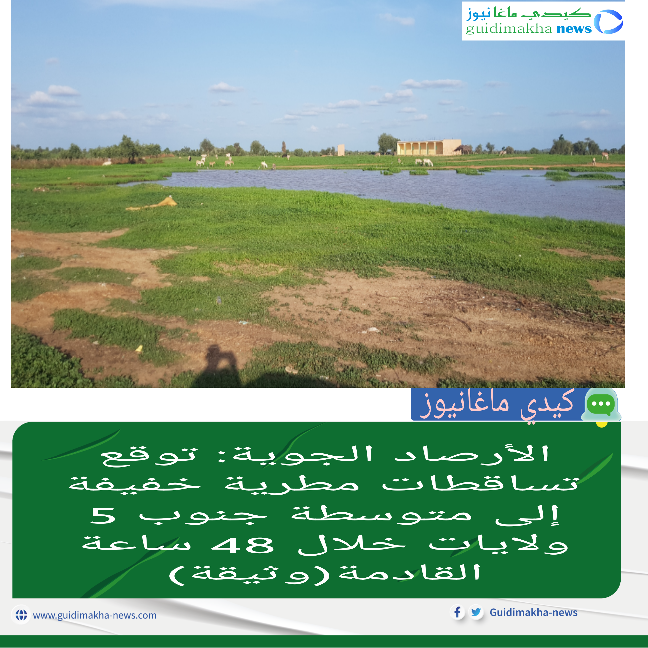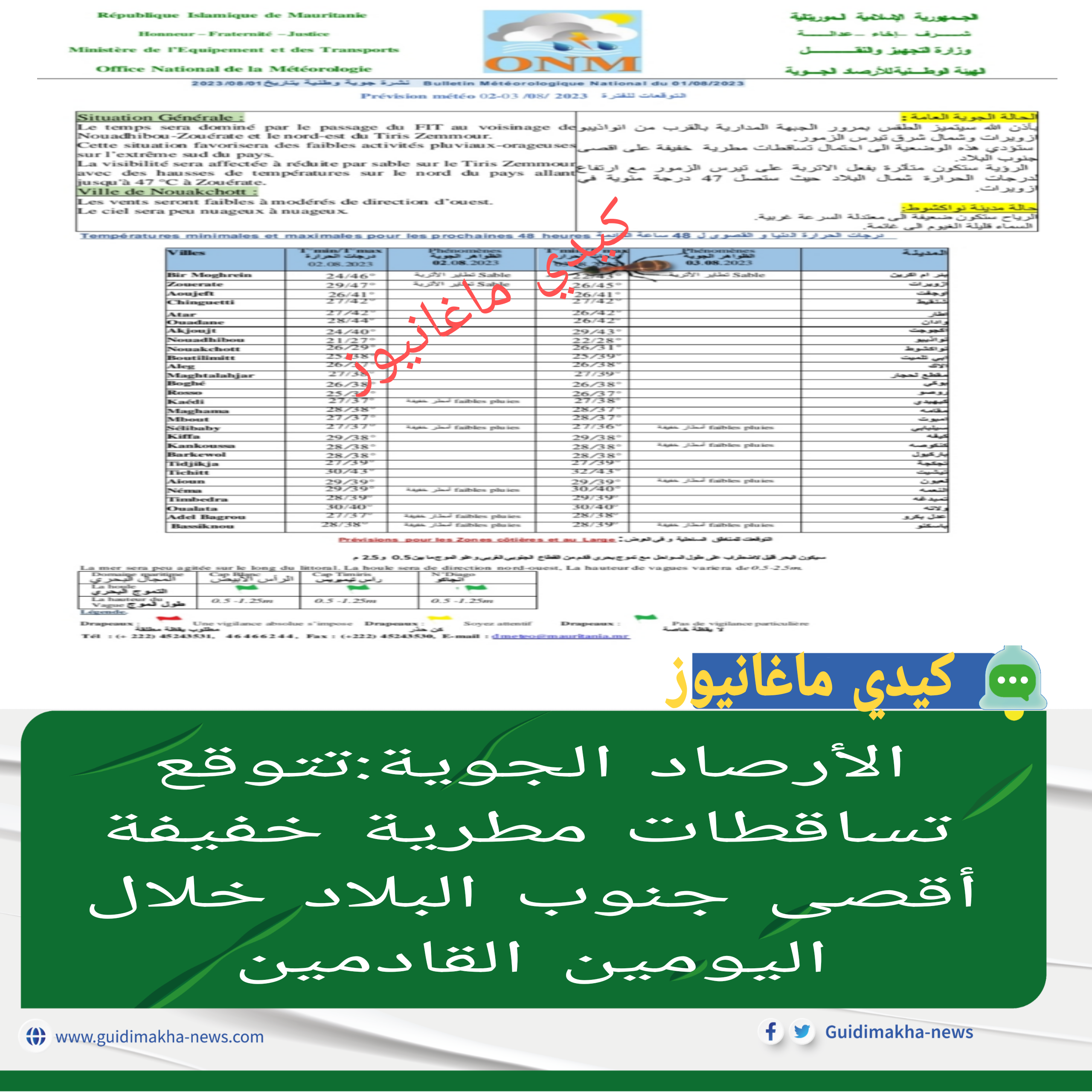 حسب الوثيقة الصادرة اليوم الإثنين عن الهيئة الوطنية للأرصاد الجوية فإن الحالة الجوية العامة سيتميز الطقس بهوب رياح غربية إلى شمالية غربية مصحوبة بإنخفاض طفيف في درجات الحرارة على عموم البلاد مع توق تتوقع تساقطات مطرية خفيفة إلى متوسطة جنوب كل من ولاية الحوضين العصابة وكوركل وكيدي ماغا يومي 8-7 من الشهر الجاري