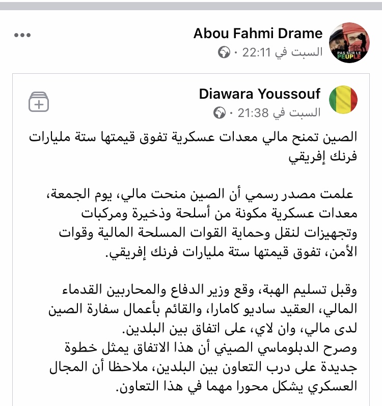 علمت مصدر رسمي أن الصين منحت مالي، يوم الجمعة، معدات عسكرية مكونة من أسلحة وذخيرة ومركبات وتجهيزات لنقل وحماية القوات المسلحة المالية وقوات الأمن، تفوق قيمتها ستة مليارات فرنك إفريقي.