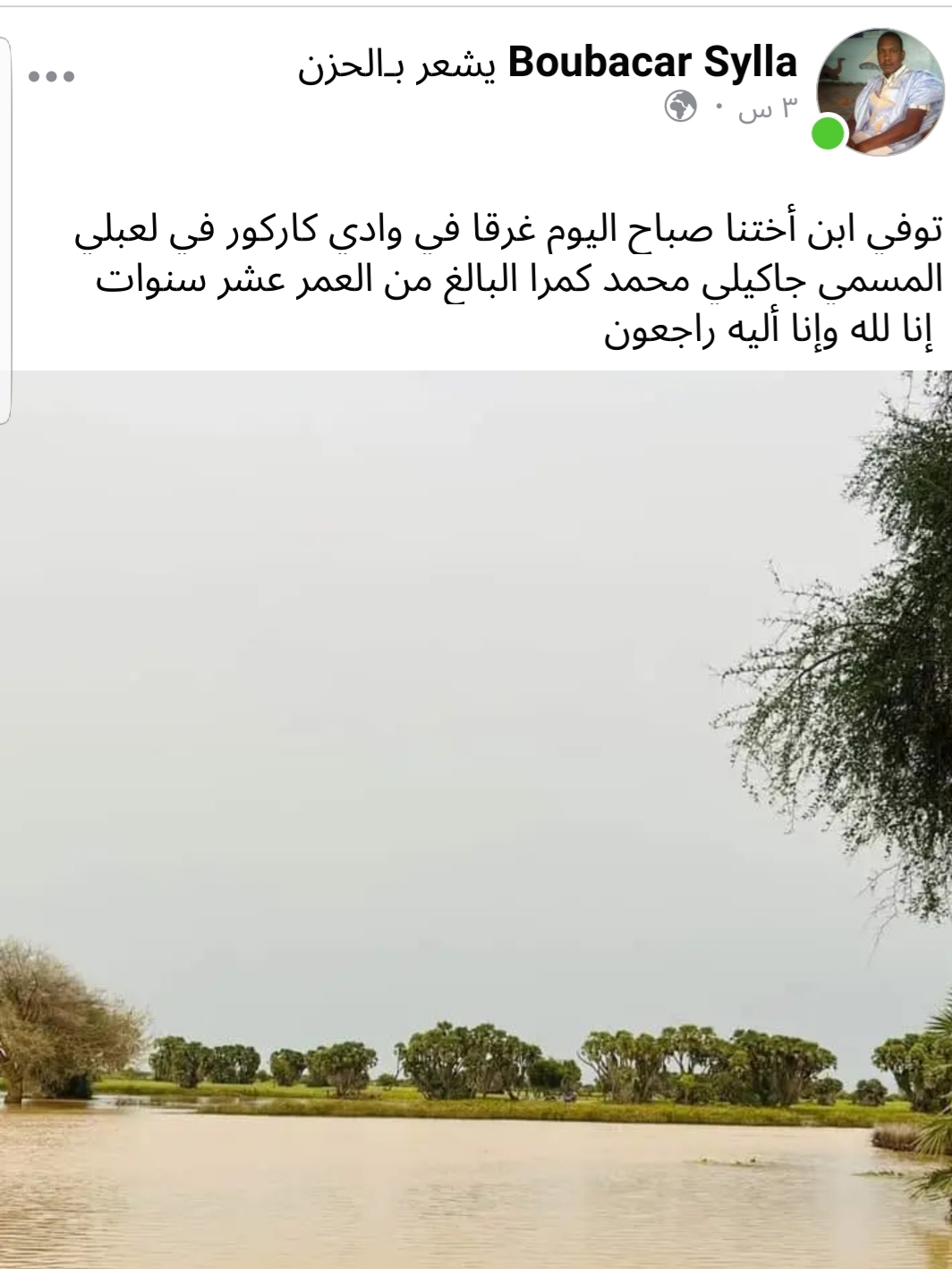 توفي صباح اليوم طفل في ربيعه العاشر يدعى أدياكلي محمد كمرا نتيجة غرقه بوادي كاركورو المحاذي لقرية لعبلي والذي يمثل الحدود الطبيعية بين بلادنا والجارة مالي كما يشكل الوالدي أيضا رافدا إقتصاديا مهمابالإضافة إلى كونه أحد أهم الروافد المائية للنهر السينغالي.