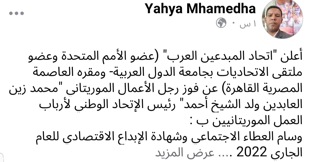 أعلن "اتحاد المبدعين العرب" (عضو الأمم المتحدة وعضو ملتقى الاتحاديات بجامعة الدول العربية- ومقره العاصمة المصرية القاهرة) عن فوز رجل الأعمال الموريتاني "محمد زين العابدين ولد الشيخ أحمد" رئيس الإتحاد الوطني لأرباب العمل الموريتانيين ب :