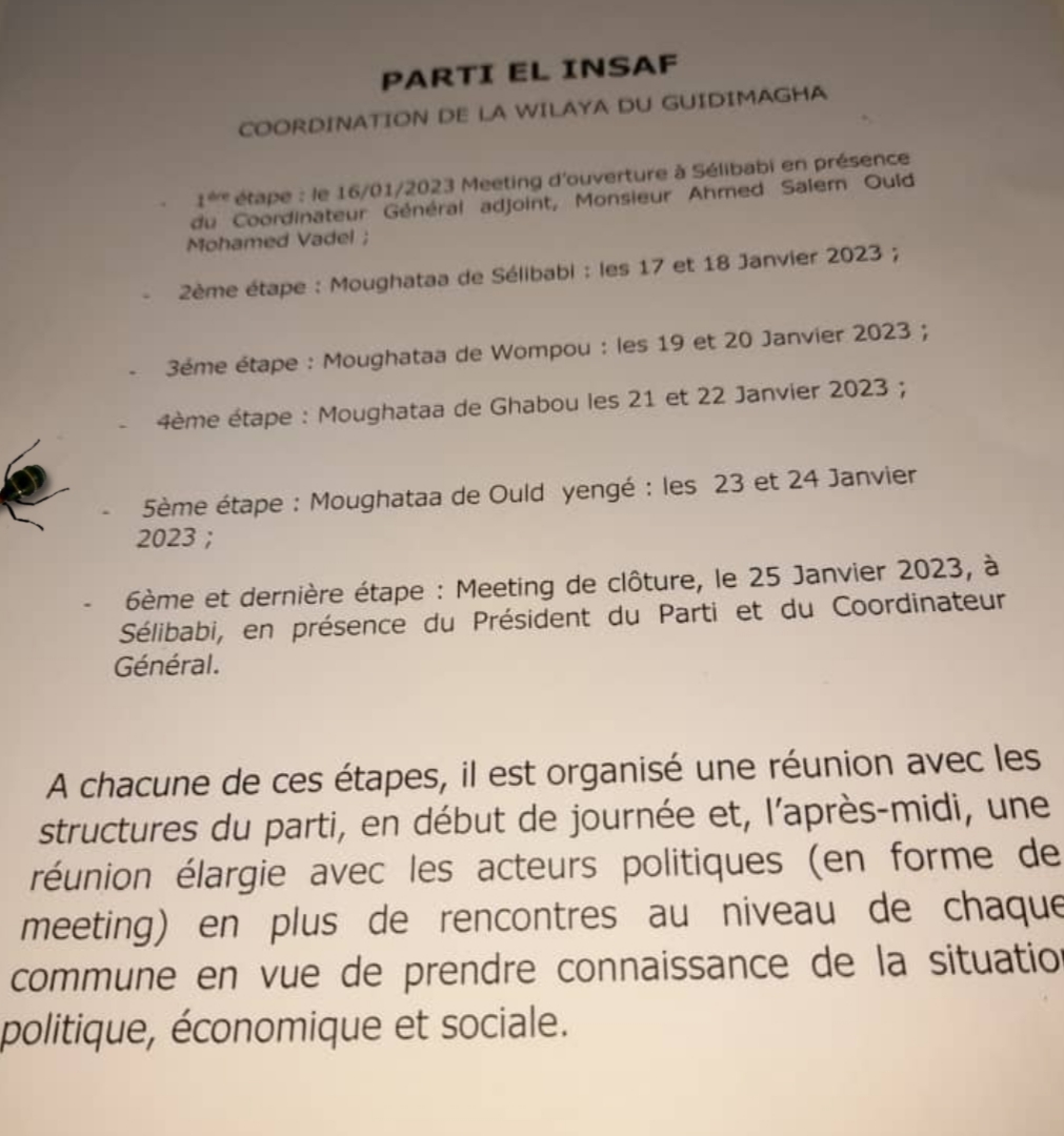 المرحلة السادسة والأخيرة الاجتماع الختامي بسيلبابي بتاريخ 25يناير 2023بحضور رئيس حزب الإنصاف والمنسق العام وفي كل مرحلة من هذه المراحل يتم لقاء مع هياكل الخزب في بداية اليوم وفي فترة مابعد الظهر اجتماع موسع مع الفاعلين السياسيين في شكل لقاء بالاضافة إلى اجتماعات في مستوى كل مجتمع من أجب التعرف على الوضع السياسي والاقتصادي والاجتماعي