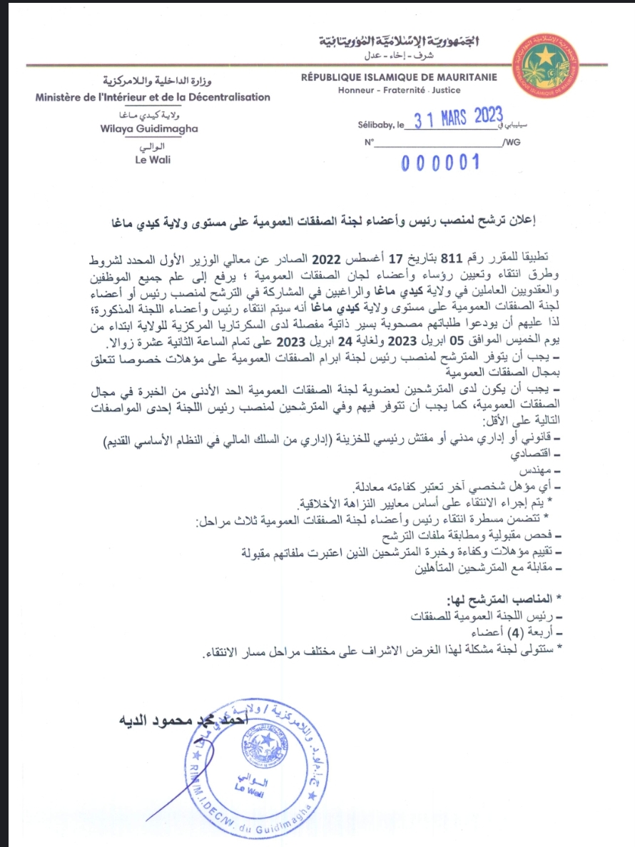 تطبيقا للمقرر رقم 811 بتاريخ 17 أغسطس 2022 الصادر عن معالي الوزير الأول المحدد لشروط وطرق انتقاء وتعيين رؤساء واعضاء لجان الصفقات العمومية يرفع إلى جميع الموظفين والعقدويين العاملين في ولاية كيدي ماغا والراغبين في المشاركة في الترشح لمنصب رئيس وأعضاء لجنة الصفقات العمومية على مستوى ولاية كيدي ماغا أنه سيتم انتقاء رئيس وأعضاء اللجنة المذكورة . لذا عليهم أن يودعوا طلباتهم مصحوبة بسر ذاتيه مفصلة لدى السكرتيريا المركزية للولاية ابتداء من يوم الخميس الموافق 5 إبريل 2023 ولغاية 24 إبريل 2023 على تمام الثانية عشر زوالا