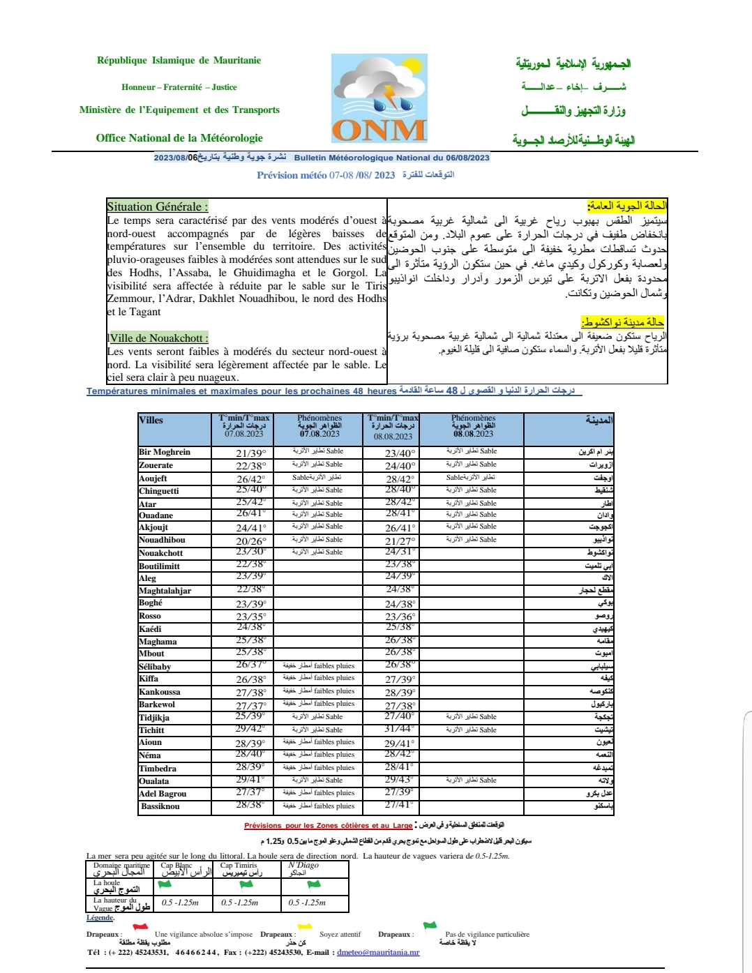 حسب الوثيقة الصادرة اليوم الإثنين عن الهيئة الوطنية للأرصاد الجوية فإن الحالة الجوية العامة سيتميز الطقس بهوب رياح غربية إلى شمالية غربية مصحوبة بإنخفاض طفيف في درجات الحرارة على عموم البلاد مع توق تتوقع تساقطات مطرية خفيفة إلى متوسطة جنوب كل من ولاية الحوضين العصابة وكوركل وكيدي ماغا يومي 8-7 من الشهر الجاري