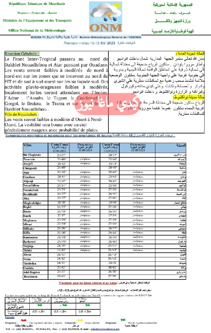 حسب الوثيقة الصادرة اليوم الإثنين عن الهيئة الوطنية للأرصاد الجوية فإن الجبهة المدارية ستمر شمال داخلت أنواذيبو وأطار مرورا بودان