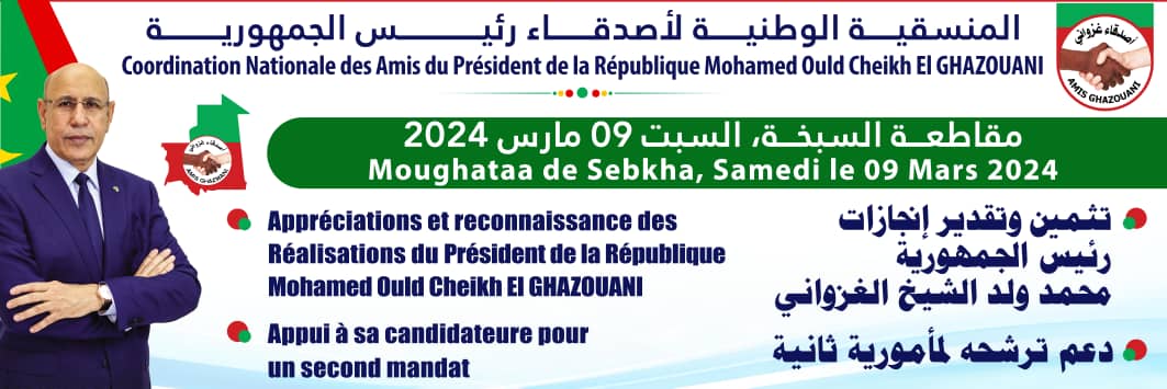 هذا وقبل أن ينهي المنسق كلمته أعلن دعم ومساندة المنسقية اللا مشروط وترشيحها لرئيس الجمهورية محمد ولد الشيخ الغزواني لمأمورية ثانية ضما لاستكمال مسيرة البناء التي أطلقها فور توليه سدة الحكم في البلاد.