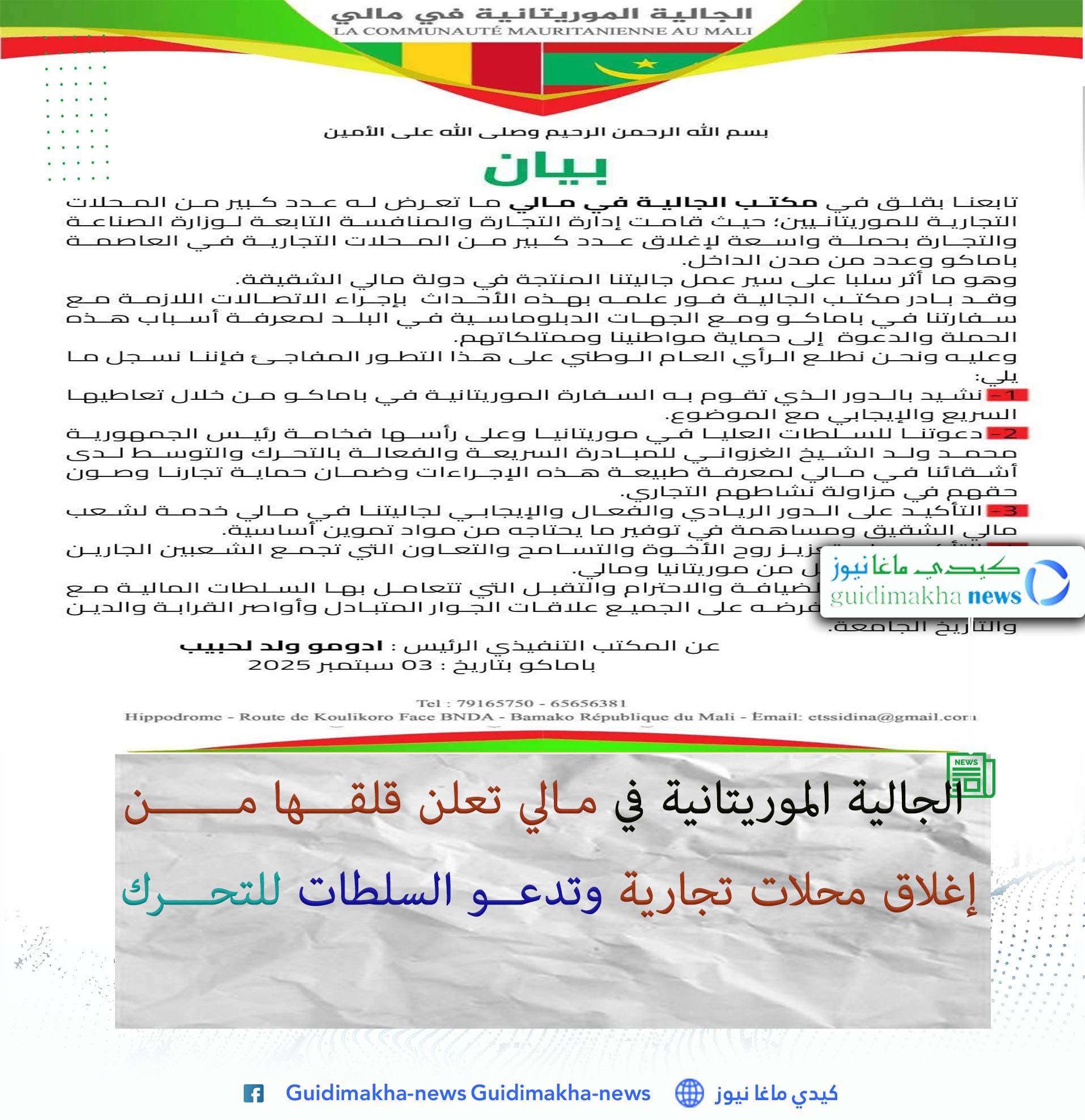 وقال المكتب في بيان أصدره اليوم 3 سبتمبر 2025 إن ما جرى يمسّ سير عمل الجالية المنتجة في مالي، مشيرًا إلى أنه بادر فور علمه بالموضوع إلى إجراء اتصالات مع السفارة الموريتانية والجهات الدبلوماسية لمعرفة أسباب الحملة والدعوة إلى حماية المواطنين وممتلكاتهم.
