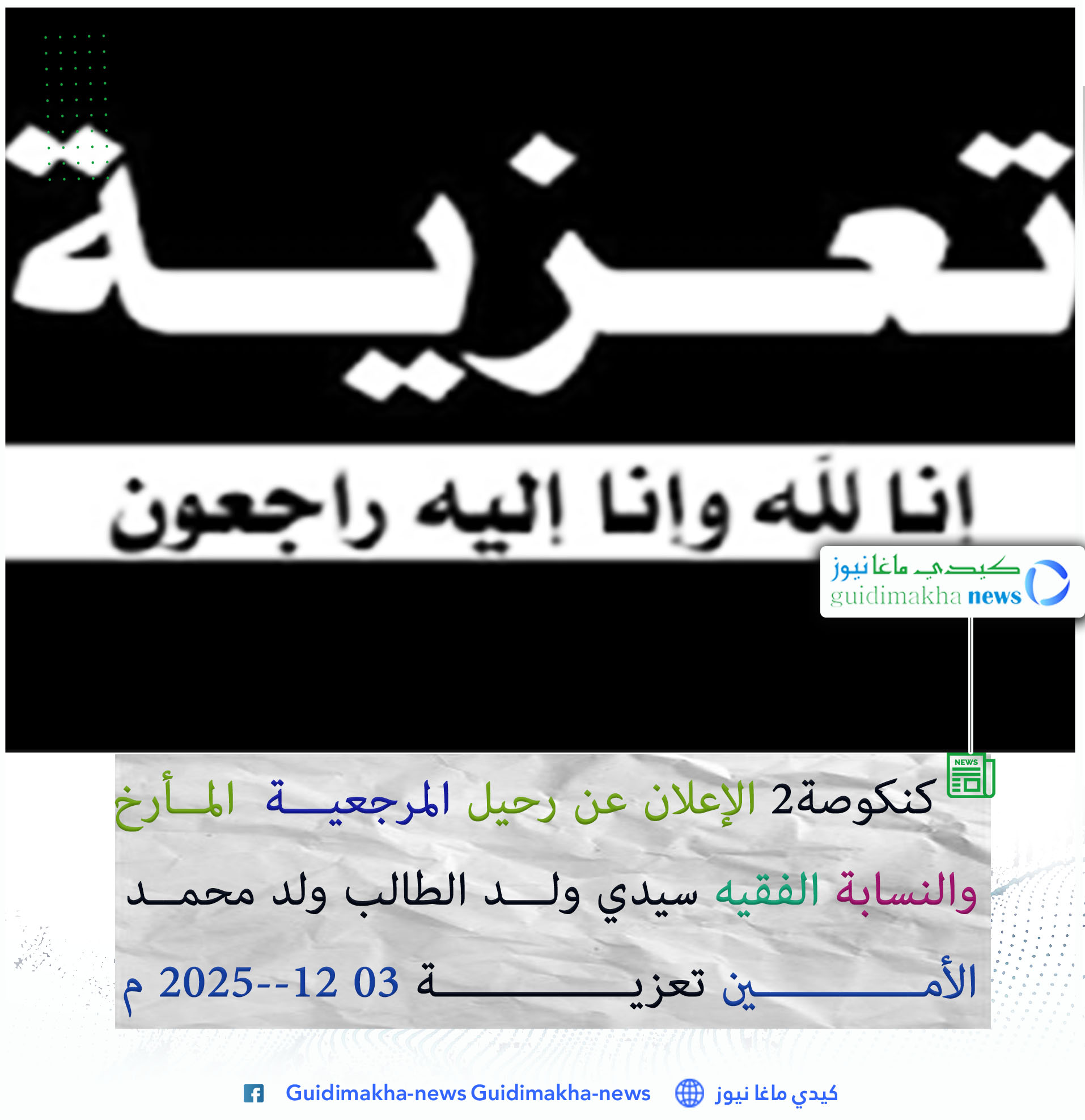 تلقينا ببالغ الأسى والحزن صباح اليوم الأربعاء 03 دسمبر 2025 م من كنكوصة 2 (أولاد حمه ) نبأ وفاة المغفور له بإذن الله تعالى المرجعية الاجتماعية المأرخ والنساب الفقيه الذي لا يمل حديثه الوالد سيدي ولد الطالب ولد محمد الأمين