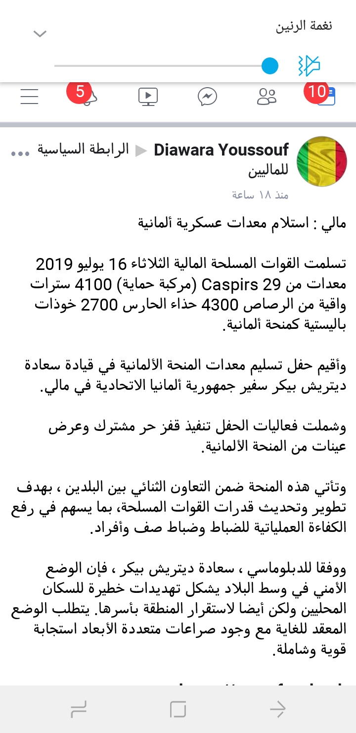 تسلمت القوات المسلة المالية الثلاثاء 16 يوليو 2019 معدات من نوع 29 (مركبة حماية ) 4100 سترات واقية من الرصاص 4300 حذاء الحارس 2700 خوذات باليستيه كمنحة ألمانية