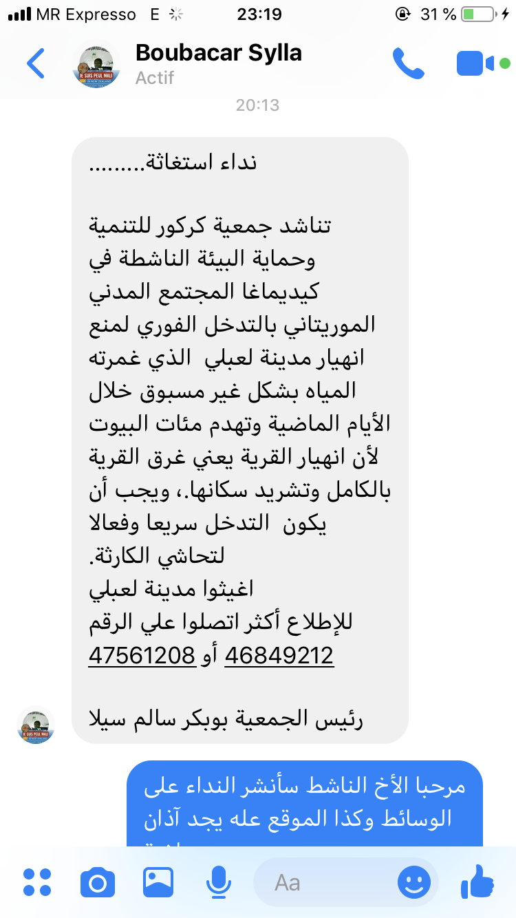 تناشد جمعية كركور للتنمية وحماية البيئة الناشطة في كيدي ماغا المجتمع المدني الموريتاني بالتدخل الفوري لمنع انهيار مدينة لعبلي الذي غمرته المياه بشكل غير مسبوق خلال الأيام الماضية وتهدم مئات البيوت لأن انهيار القرية يعني انهيار القرية بالكامل وتشريد سكانها ،ويجب أن يكون التدخل سريعا وفعالا لتحاشي الكارثة .